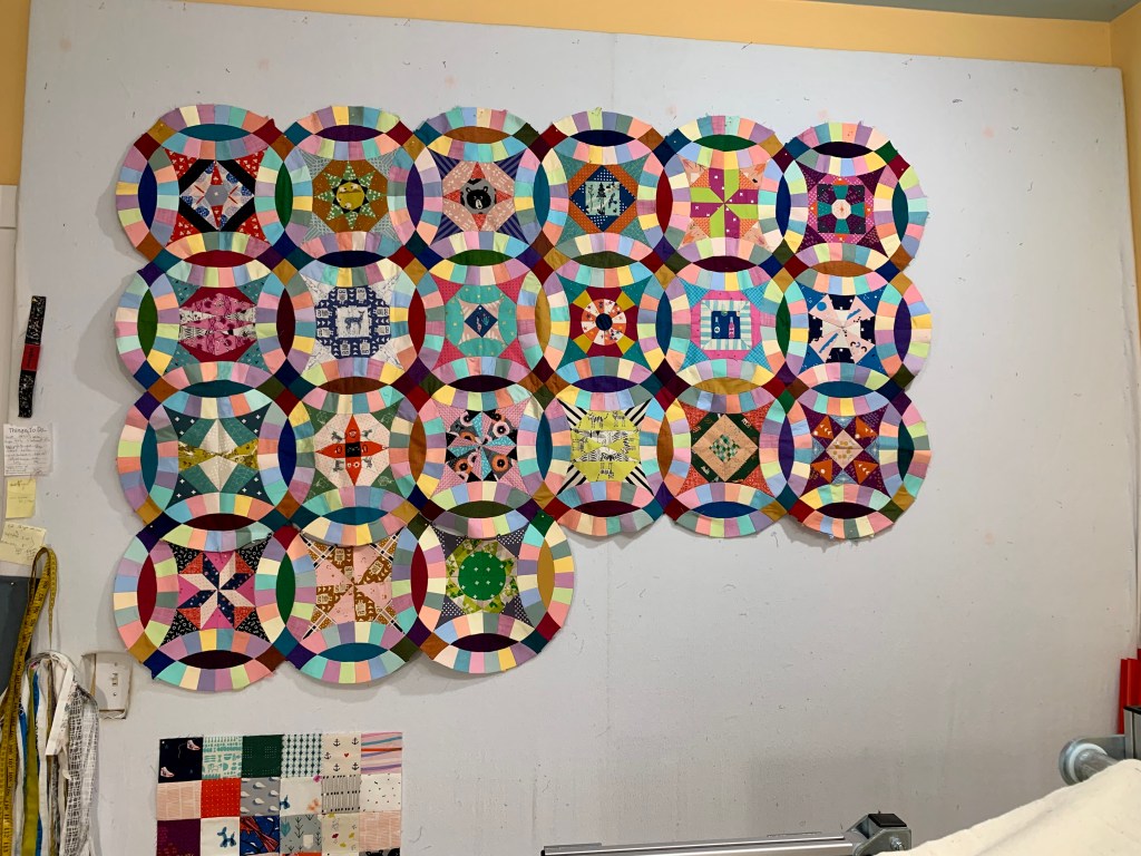 Here are the three completed rows and part of the fourth row–a picture I took way back in March 2022. I don’t even want to think how long I’ve been working on this quilt. The rings are boring to sew, and the piecing of the rings and rows is difficult going with all the curves.