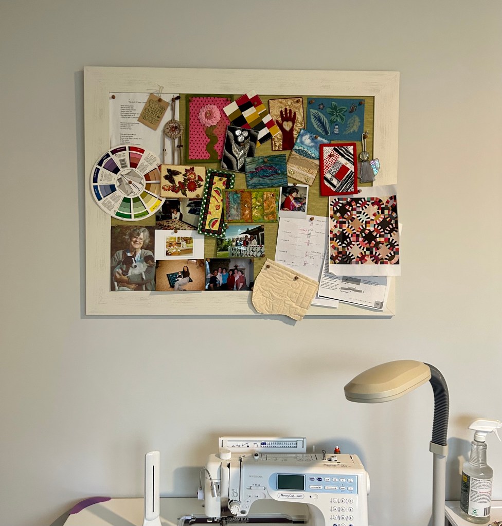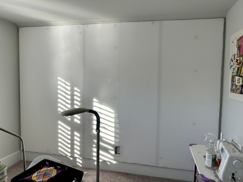 And here’s the design wall at this point. The screws and plastic washers will always be there–they were back in Maine–but it is easy enough to avoid them with pins–and the overlaid flannel mostly hides them.