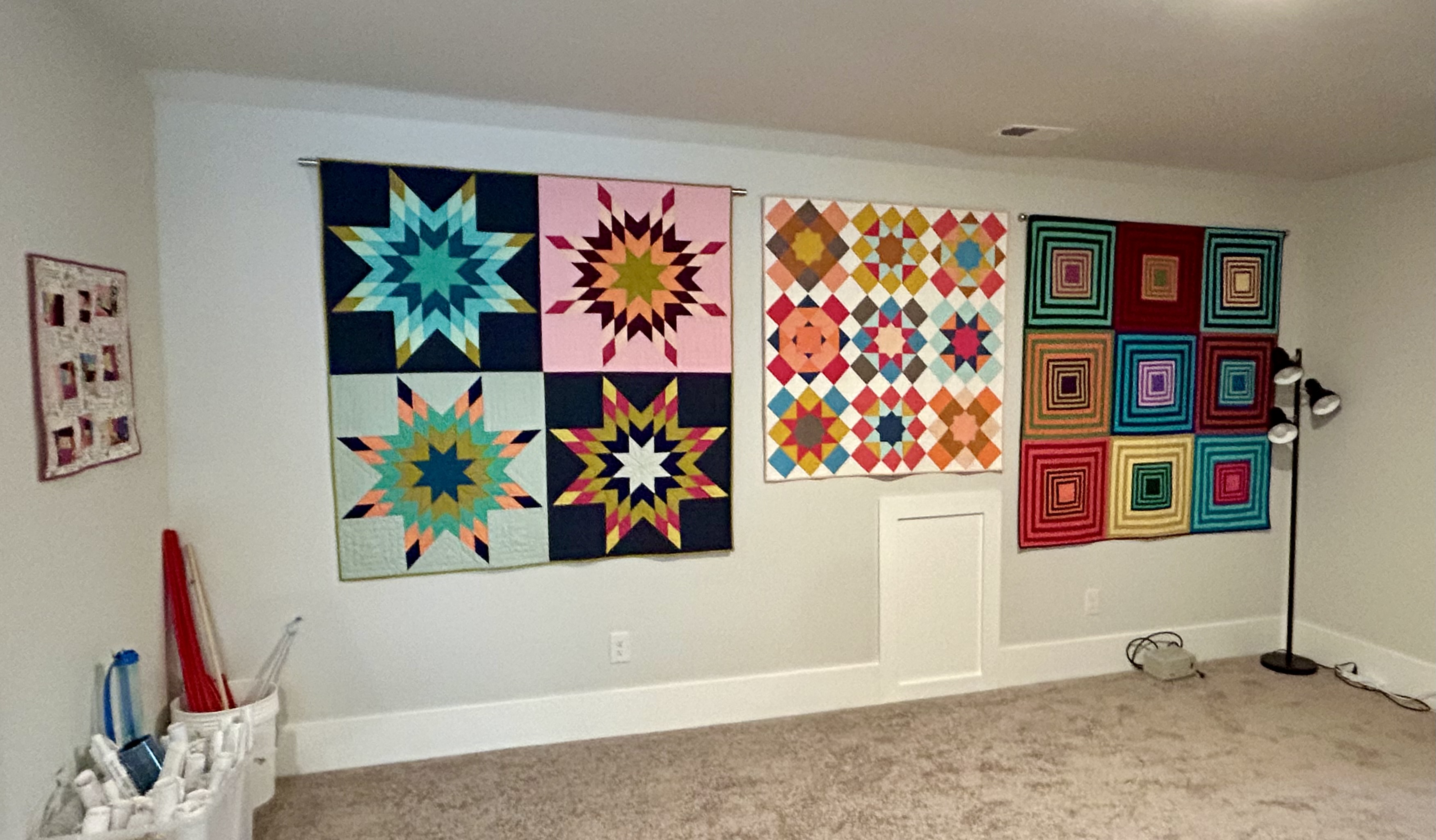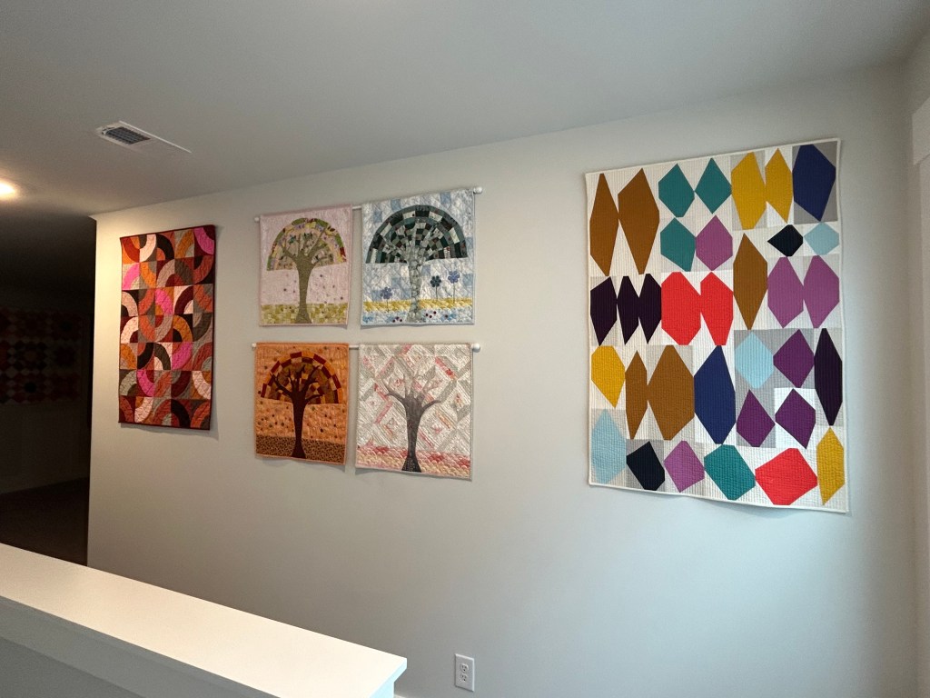 There is a long wall flanking the right side of the walkway into the larger “game room” area where the longarm will live when it arrives on the 16th. There are blog posts on all of these quilts. The quilt on the far left is made from a block and fabric palette created by Latifah Saafir as guest designer for The Color Collective. The quilt on the right in an improv method designed by Tara Faughnan for The Color Collective. The “four season” quilts in the middle were inspired by Sarah Fielke in the book by Sarah and Kathy Doughty, MATERIAL OBSESSIONS 2.
