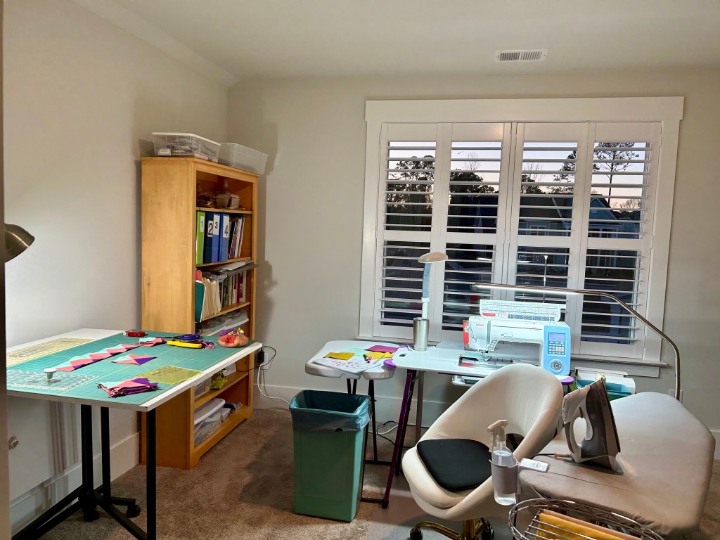 I brought the very comfortable queen blow-up bed with me, and it will be easy to set it up in the sewing room if I have overflow guests. There is the downstairs guest room, and the grey couch in the tv/sitting room is a queen sofa bed, but more privacy would be available for a guest upstairs.