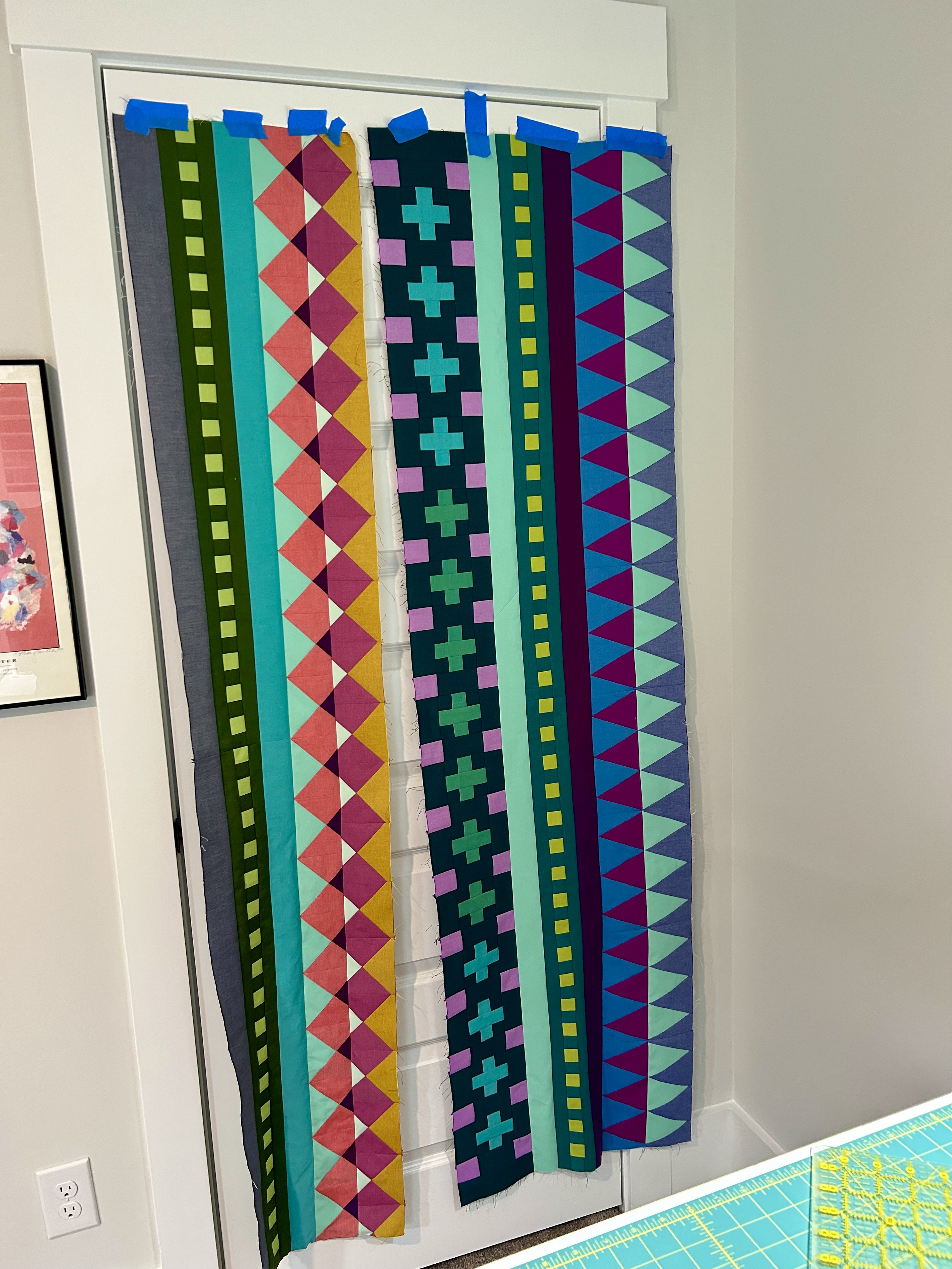 The Traverse quilt is coming along–here are two sections on what was my temporary design wall.