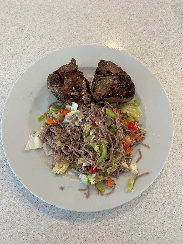 I had defrosted lamb chops for my main meal, which I eat in the middle of the day. (Costco has reasonably priced lamb, which is harder to get here than in Maine.) I had half of a small cabbage in the refrigerator, and I do like to slice cabbage thin, add salt and olive oil and some herbs (fresh dill this time), and eat it like a salad. The cabbage gets soft in a bit and exudes juices–this would be the begining step of fermenting cabbage to make a sauerkraut actually. But I can’t eat fermented foods with my Histamine Intolerance. The next thing I knew, I was adding other fresh veggies to the cabbage while the chops cooked and was putting some water on the stove to cook some buckwheat noodles.