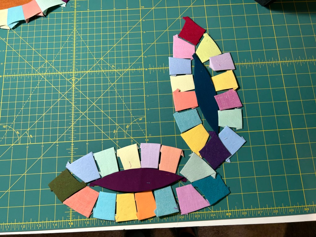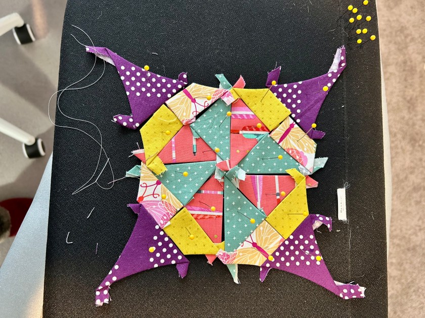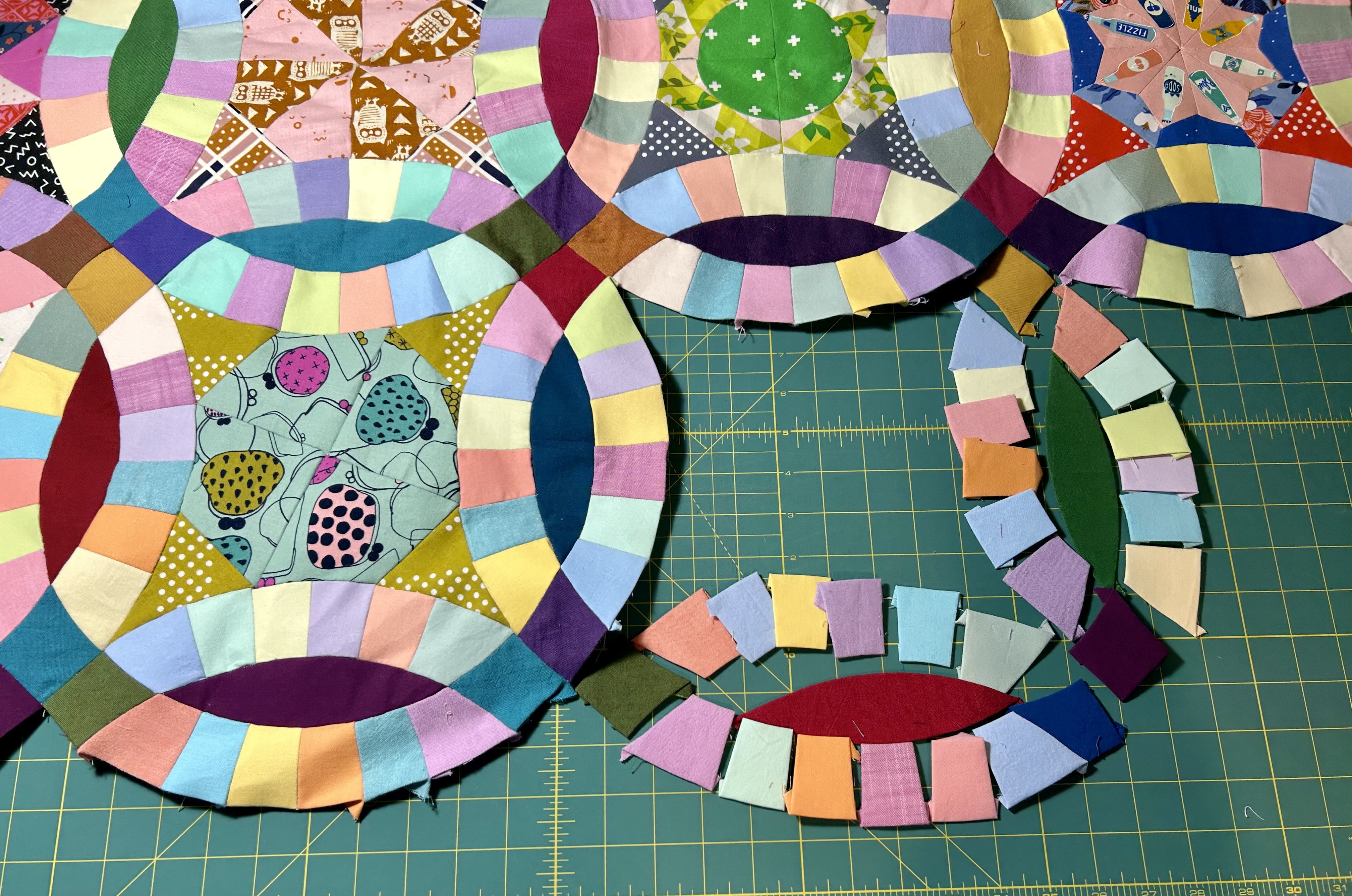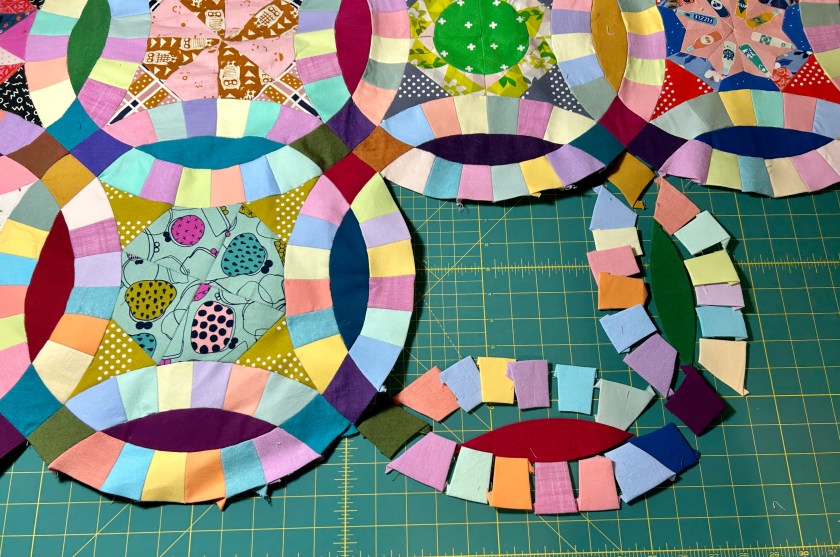 Here’s how I lay out the rings, and I can see that I will want to move the bright yellow piece at the bottom to another spot. Taking pictures of work is always…revealing. In the big scheme of things though, in the whole of a finished quilt made from so many tiny pieces, it will mostly all just work out. Mostly.