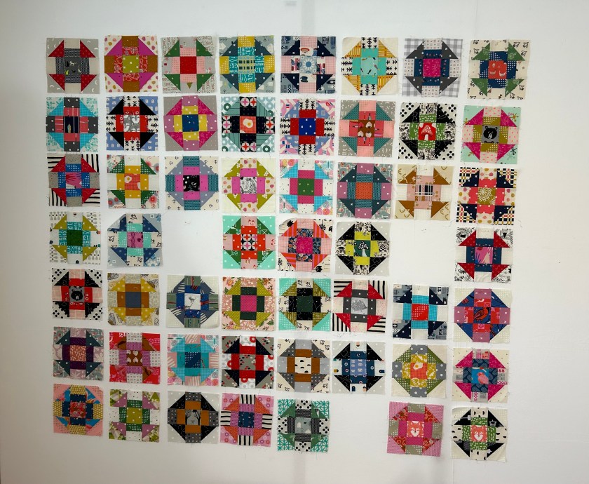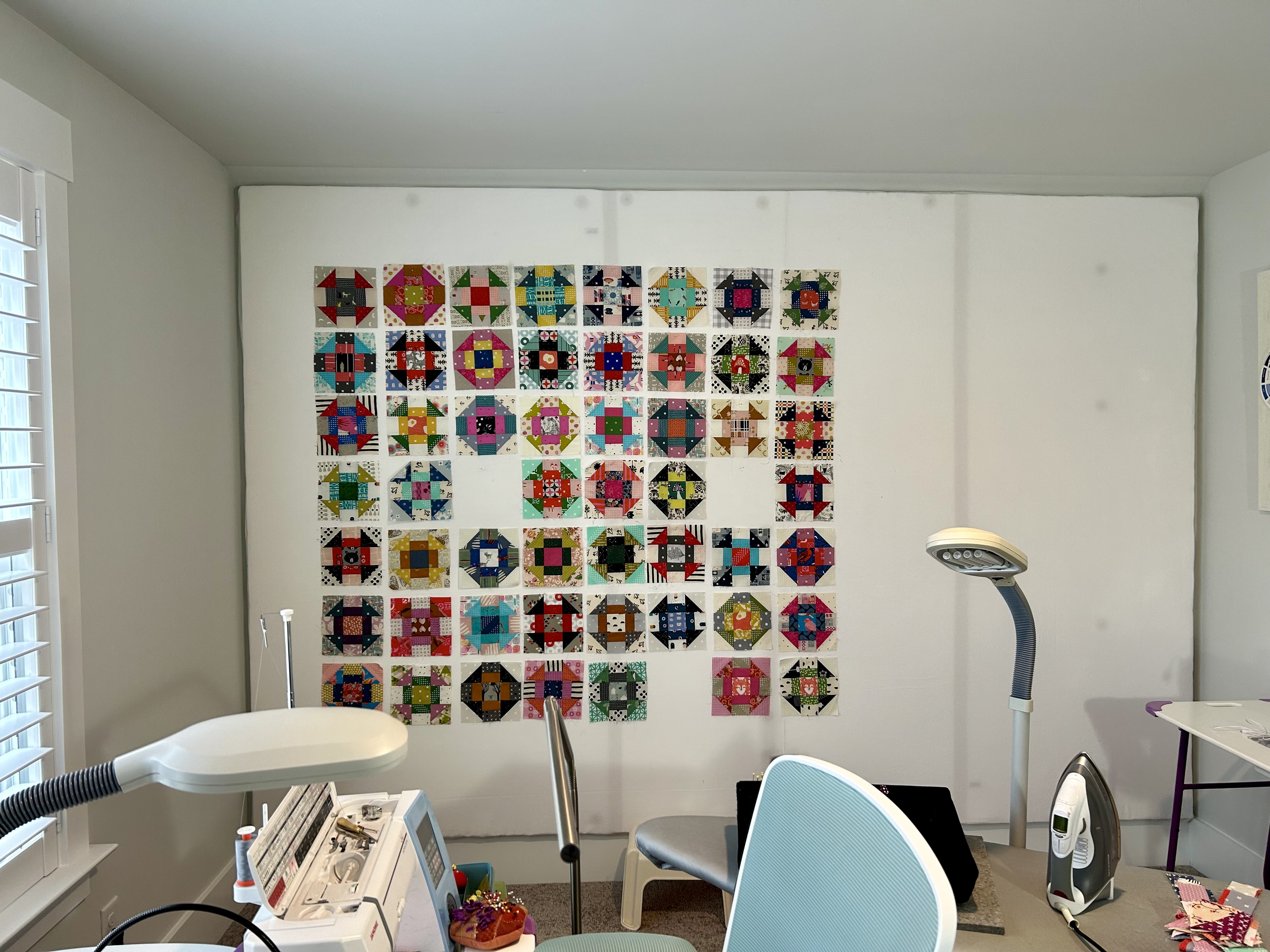 Putting up these blocks on the wall is tricky as I do not want them to distract from finishing the quilt from hell.