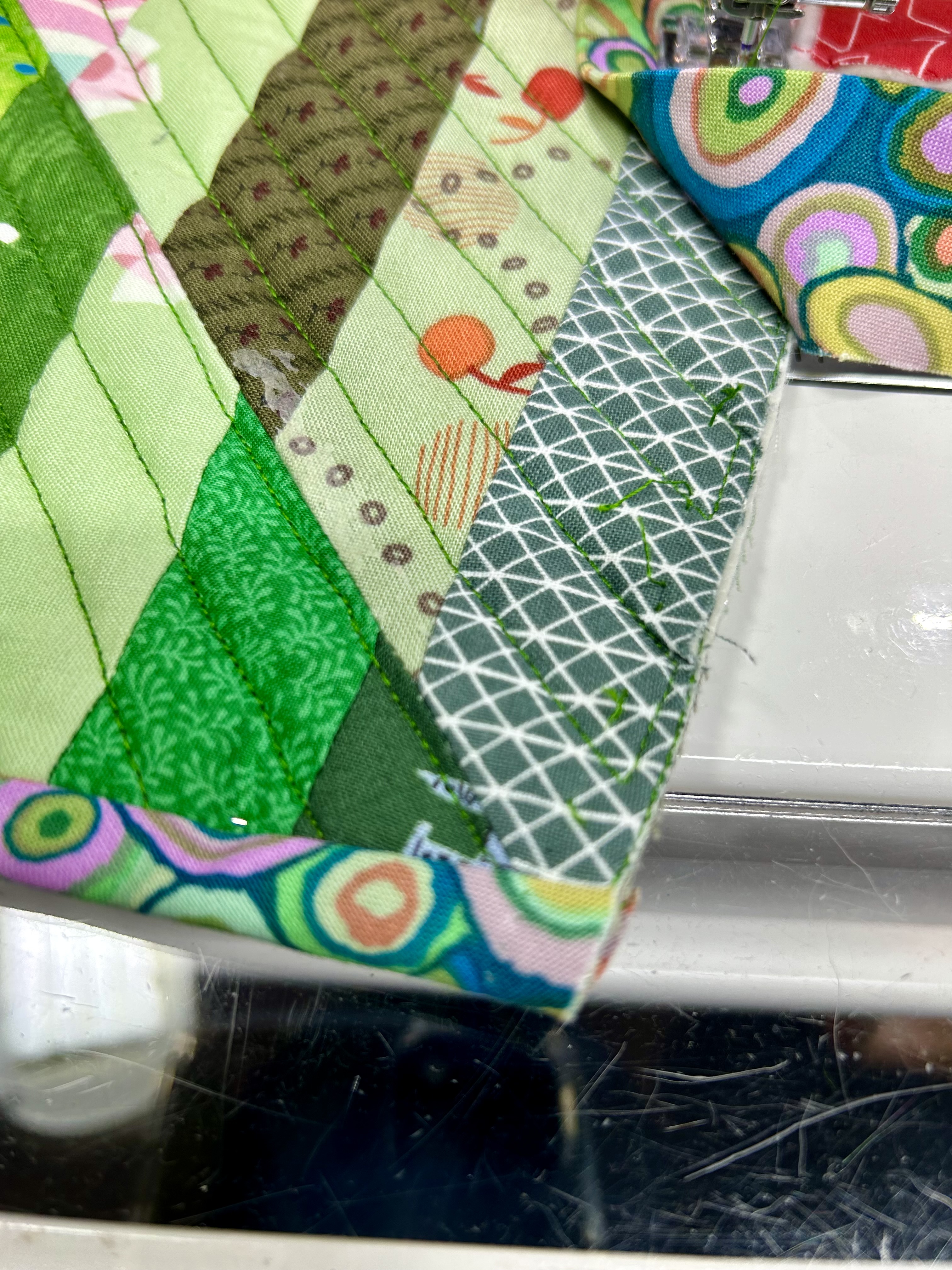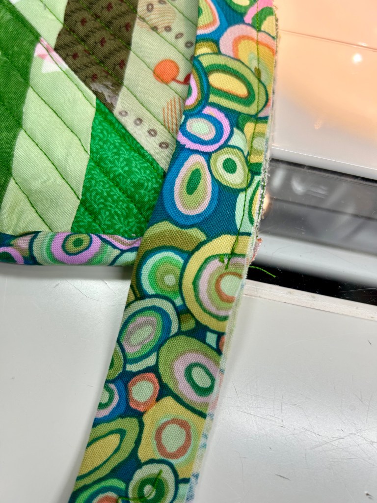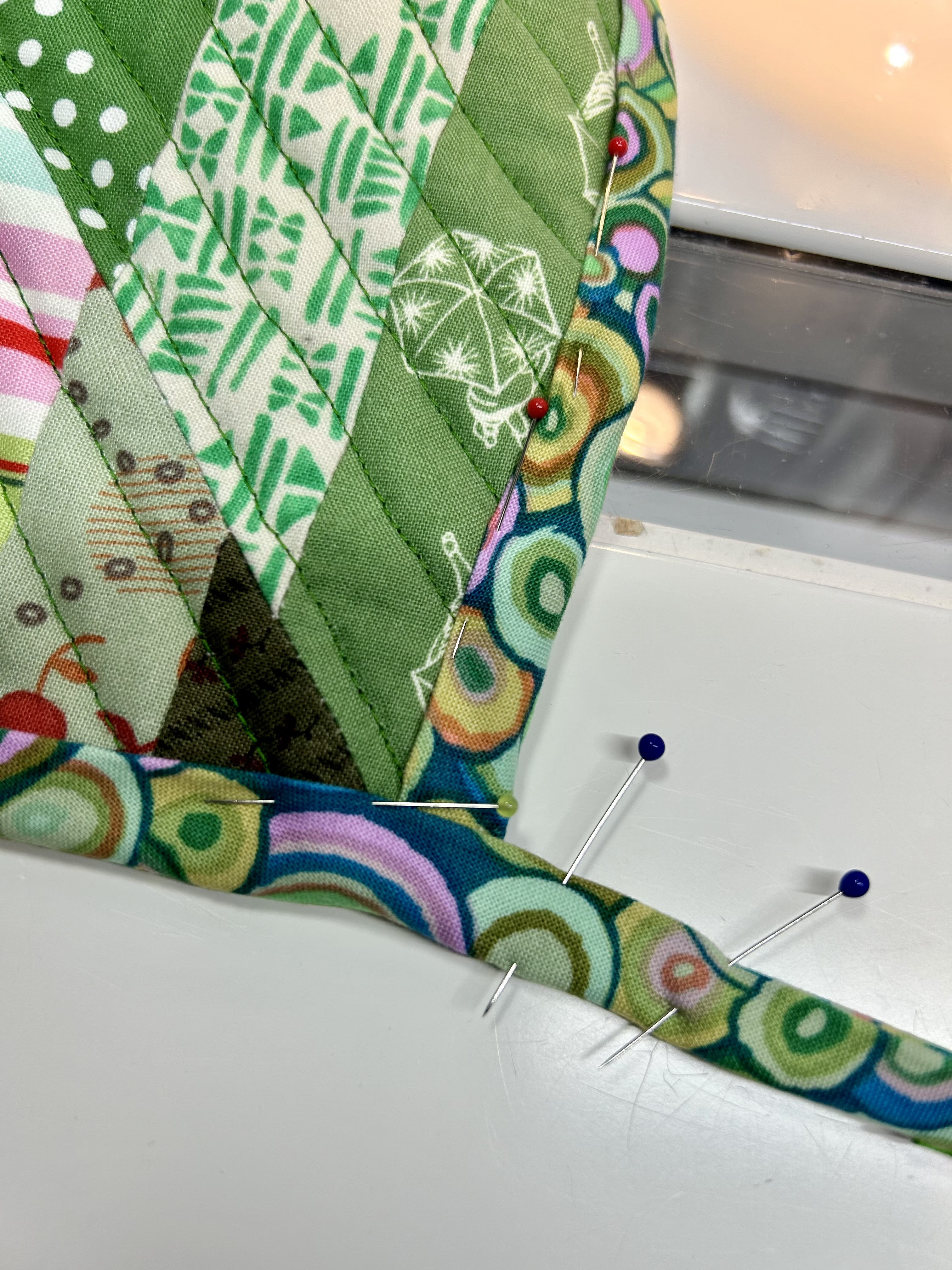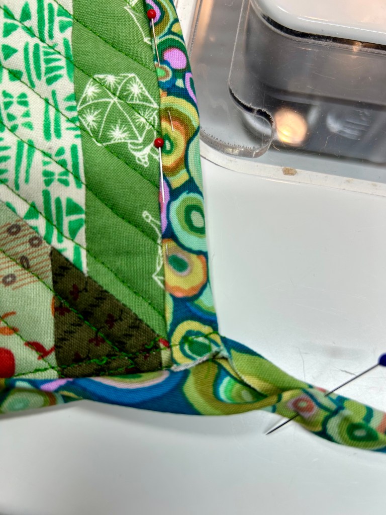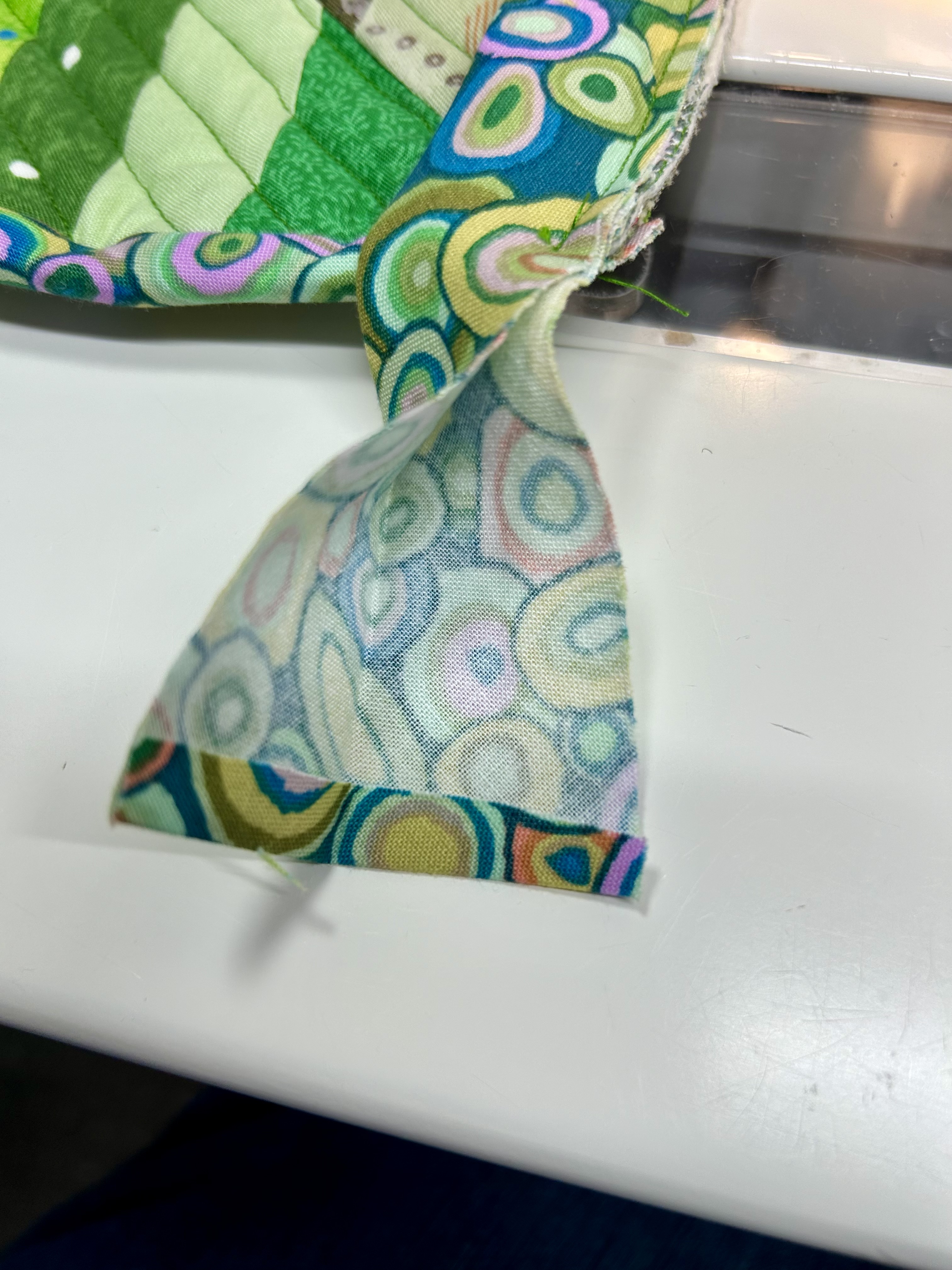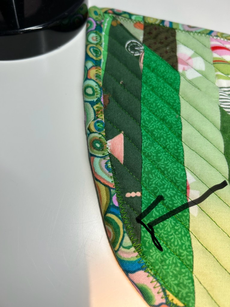 If you missed grabbing some part of the binding, just catch it with a hidden whip stitch done by hand. I am terrible at this machine sewing down of binding–and on this curved leaf potholder with the added layer of the Insul-Brite, I think maybe is also a factor of making the binding thicker and trimming well before turning the binding and sewing it down.