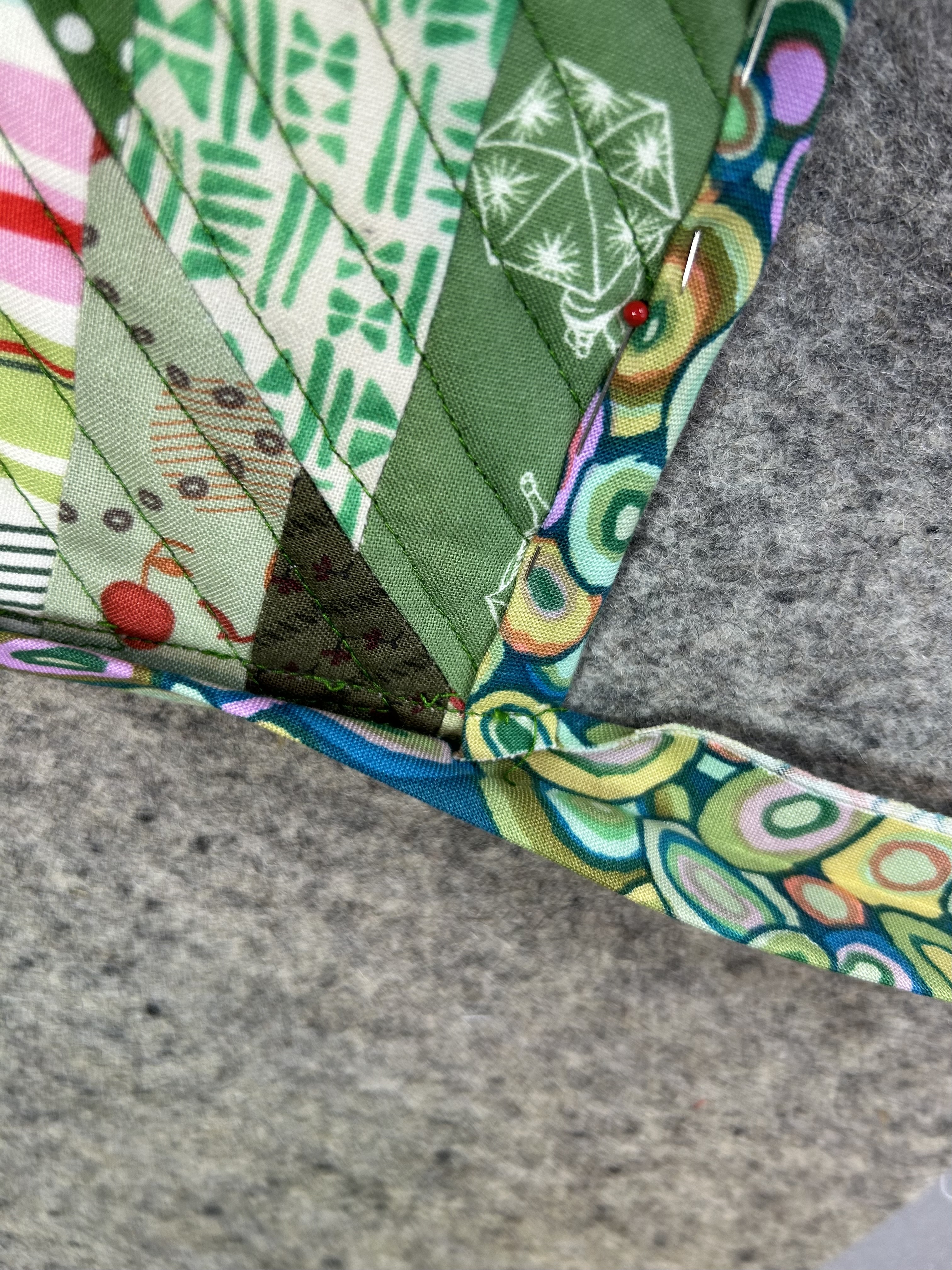 On the top side, sew down the binding. I use a zig-zag stitch–and I remove the pins as I go around. ***Start at the side that is underneath where the binding ends–not the strip side. And just start at the edge of where the top binding lies–not on that upper binding.