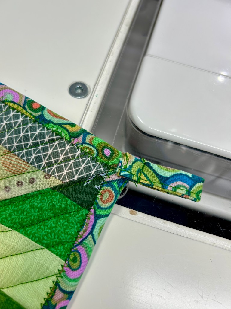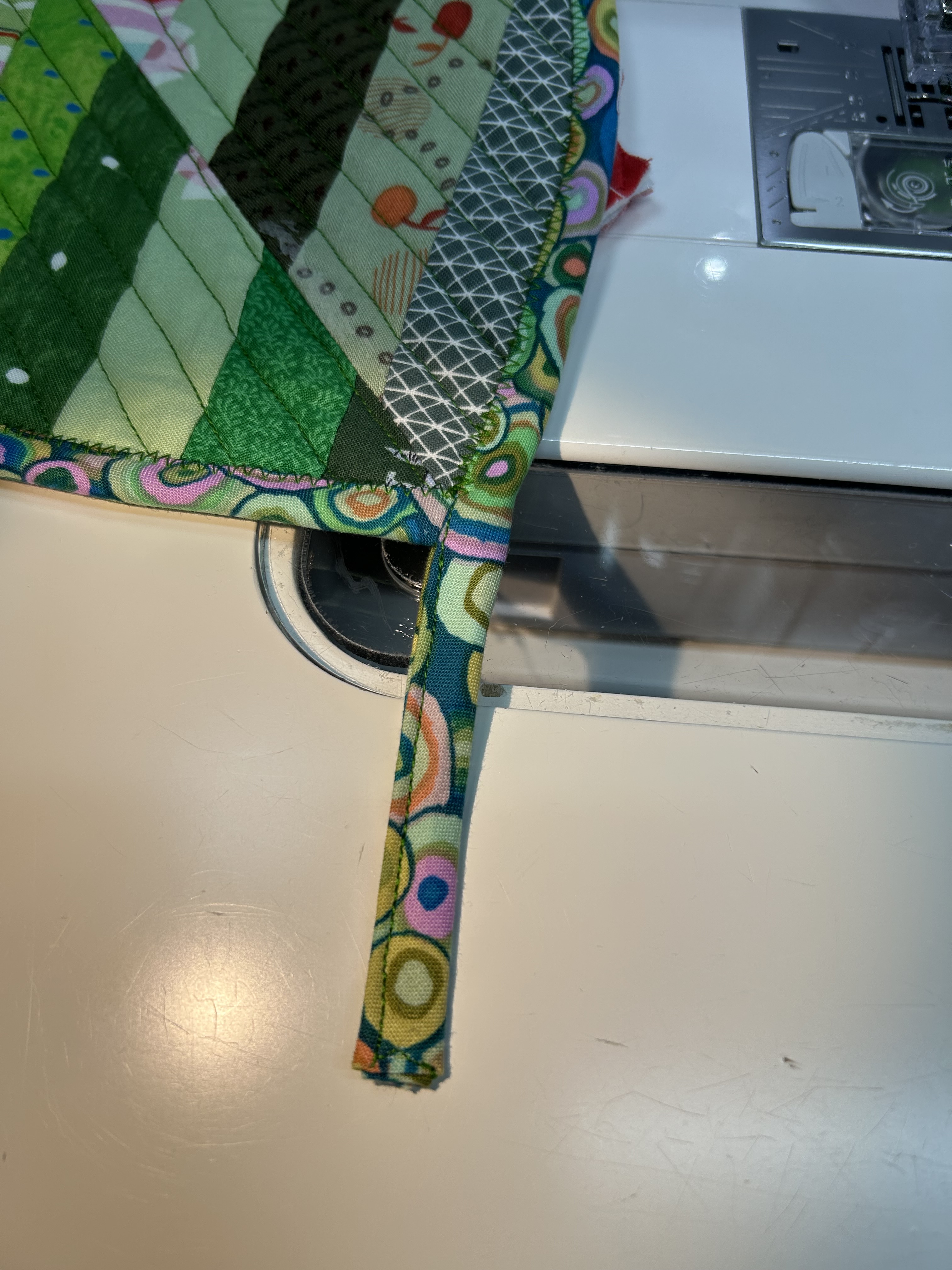When you get back to that starting point, change to a straight stitch and go down the length of your hanging strip. Sew down the folded end as best you can. It can be tricky to handle the thickness, but if you turn the potholder and use something to help the feed dogs grab the bulk, you’ll be ok. I suppose whip stitching that end closed is not a bad idea either.