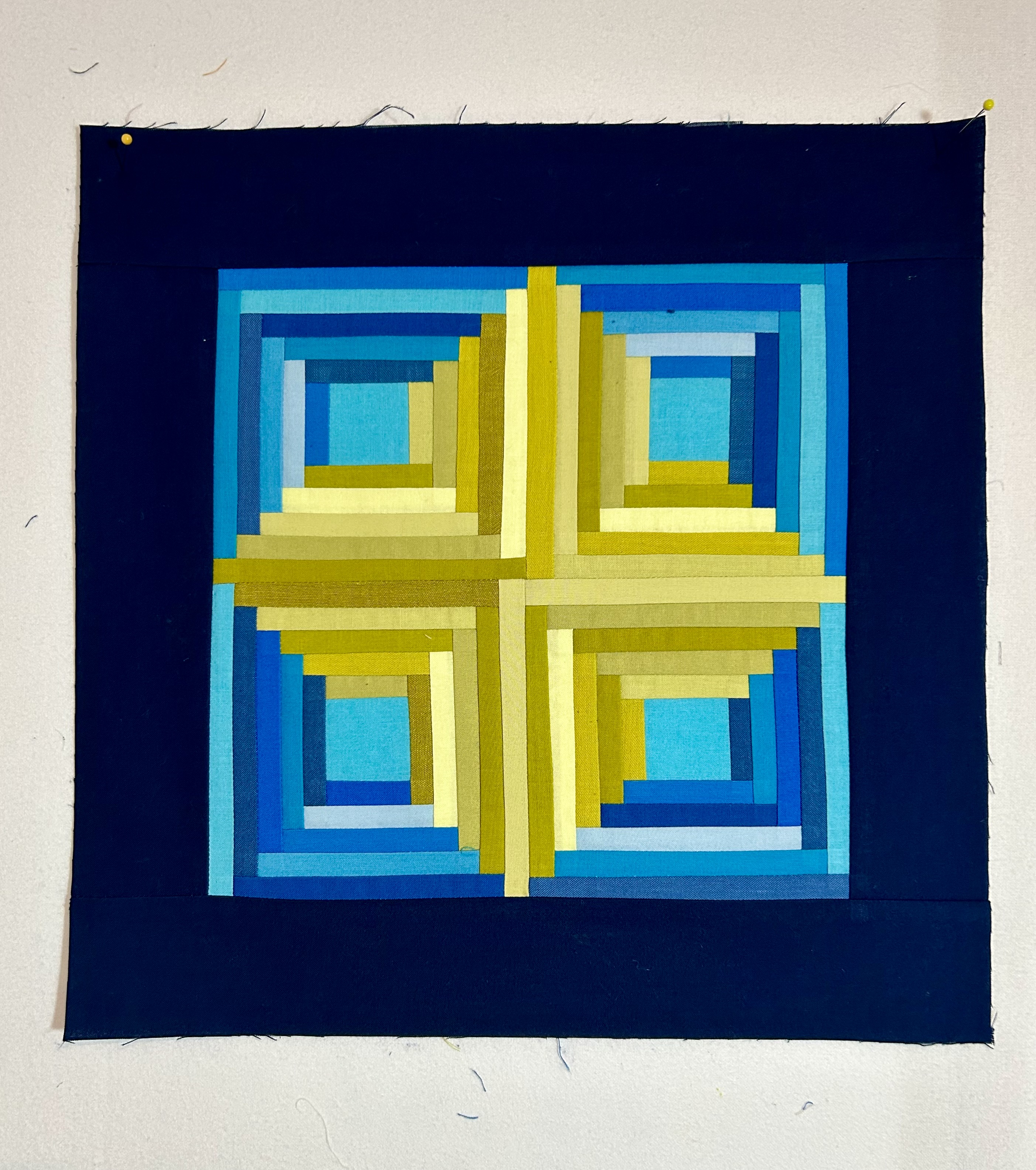 For this block–which needs its dark blue border–I ordered some 12-inch canvas frames. And I can’t wait for them to come. Maybe today. (This block is made from the palette that I pulled for this month. And, yes, the yellow green fabrics featured uses Kona pickle as its key color.)