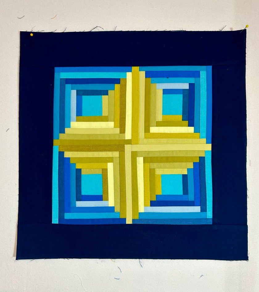 I have been having so much fun with this month’s “Block 2” block in the online class with Tara Faughnan: Log Cabins. And with learning how to install blocks on stretched canvas frames. Here’s the one I mounted yesterday–using the fabric palette I pulled in early November. It’s…so handsome.
