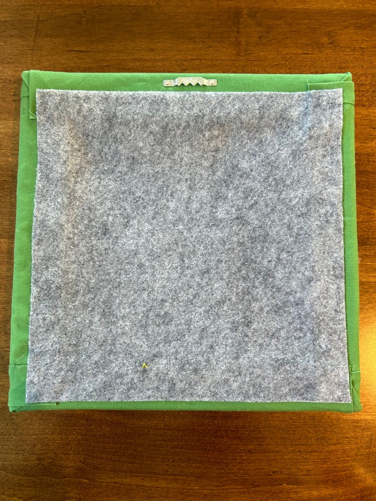 I redid the borders on the hexagon block so that it had wide enough pieces to go around to the back without struggling and stretching–which can throw off the alignment on the front. But this felt could have been cut wider. It was my first try. I glued it on the edges with a strong “tacky” glue–the same one I use for rope bowls to stabilize cut rope ends. (Note that the fabric on the left bottom corner is closer to being an almost perfect fold–which should run next to the edge of the canvas.)