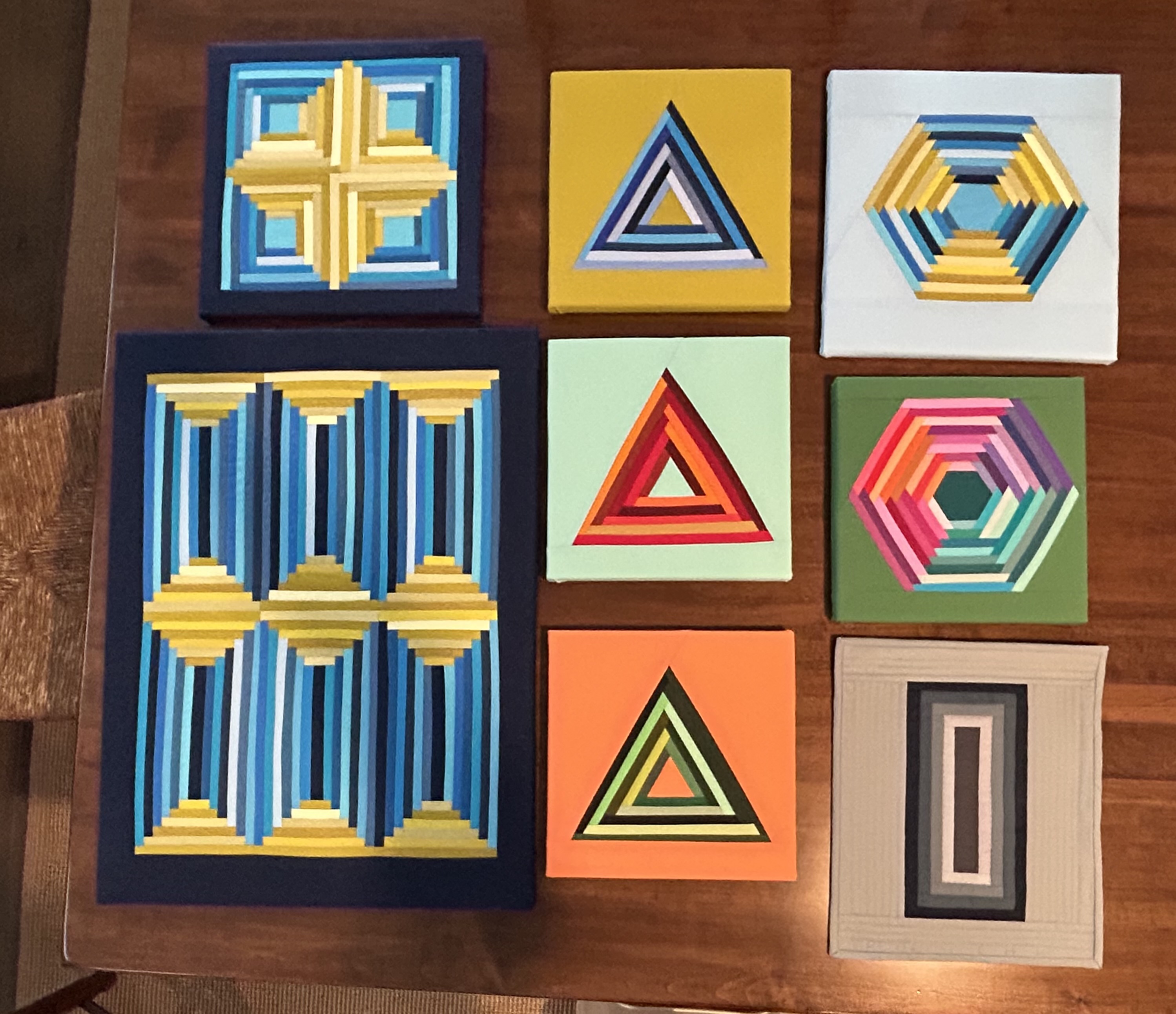 “Log Cabin” was the second month’s project, and here’s where I started learning how to put a project on stretched canvas. Tara gave us MANY variations of this narrow log cabin form, including triangles and hexagons in all sorts of sizes. I had to make myself STOP.