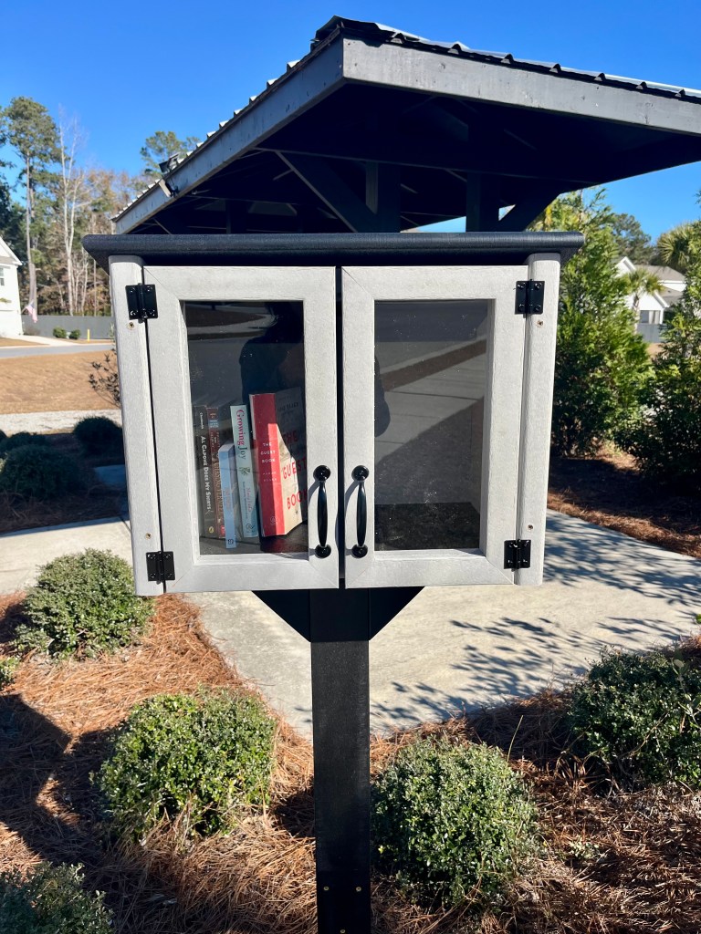 Our little kiosk is up and is slowly gathering books. (That big roof is on the mail kiosk–and does not overhang the library box–it’s a camera illusion.). But isn’t the kiosk adorable?