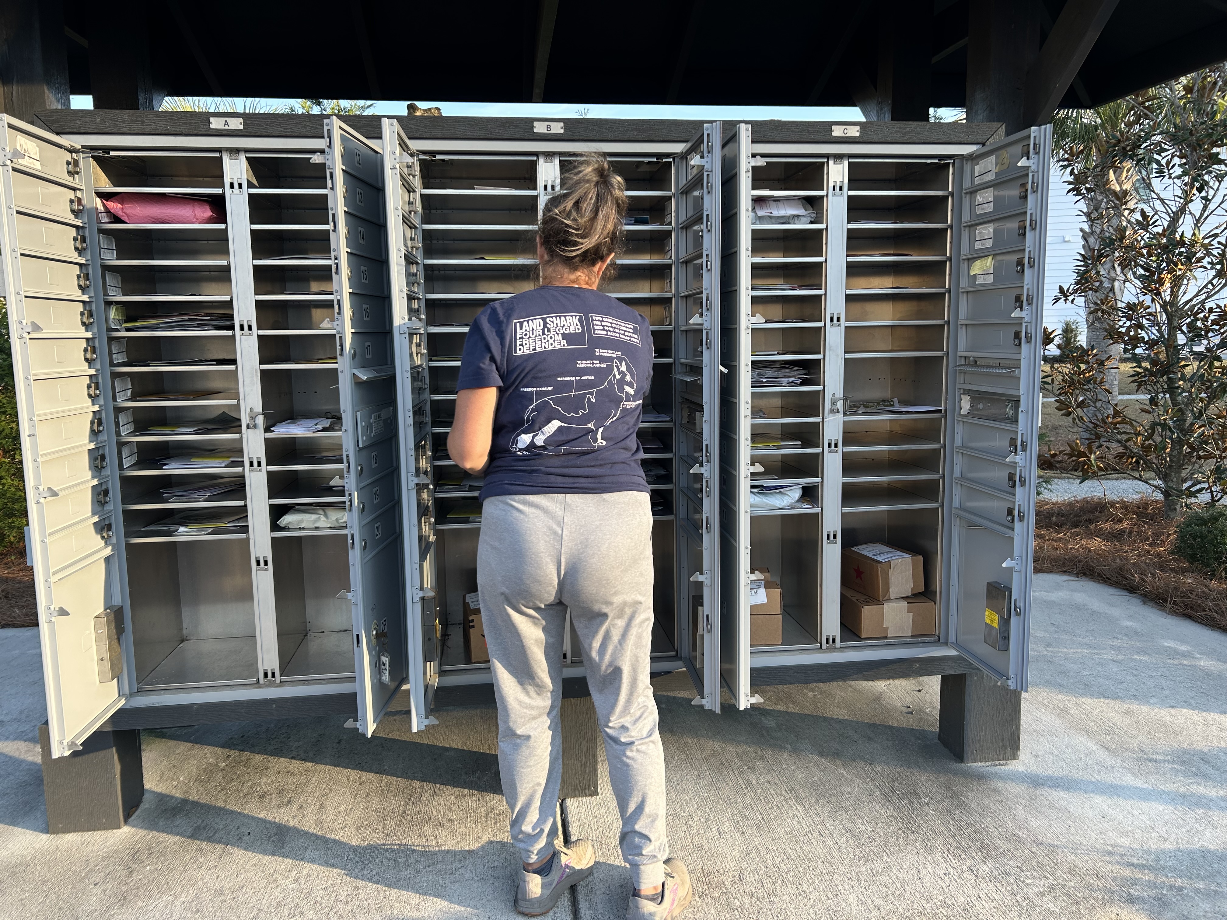 I went down the other day to check for a mailed package–and found the mail person with the whole kiosk open–and I thoght that was pretty interesting. When we get a package that won’t fit into our narrow “box,” it goes into ONE of the bigger bins below–and we get a key to open that box in our mailbox. Once in the bigger box and the door is open, the key cannot be extracted. The mail person said that for packages that don’t fit, she has to drop them off at our houses. (Can I just say that sometimes that takes several days to happen!!!!)