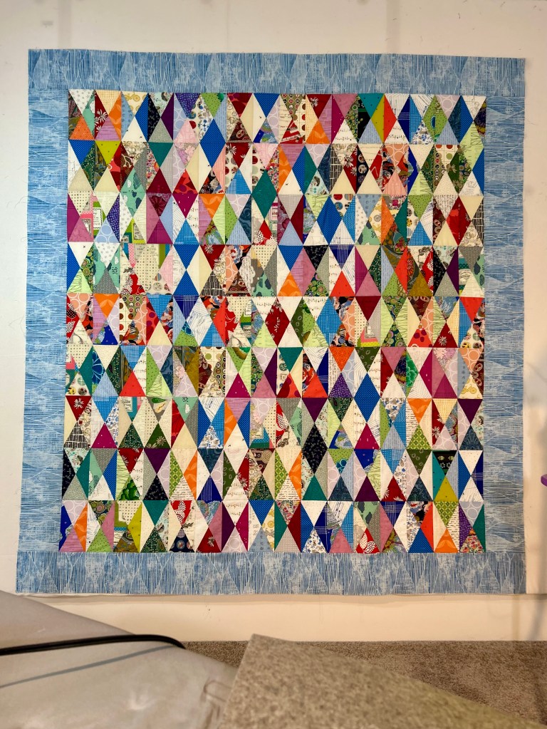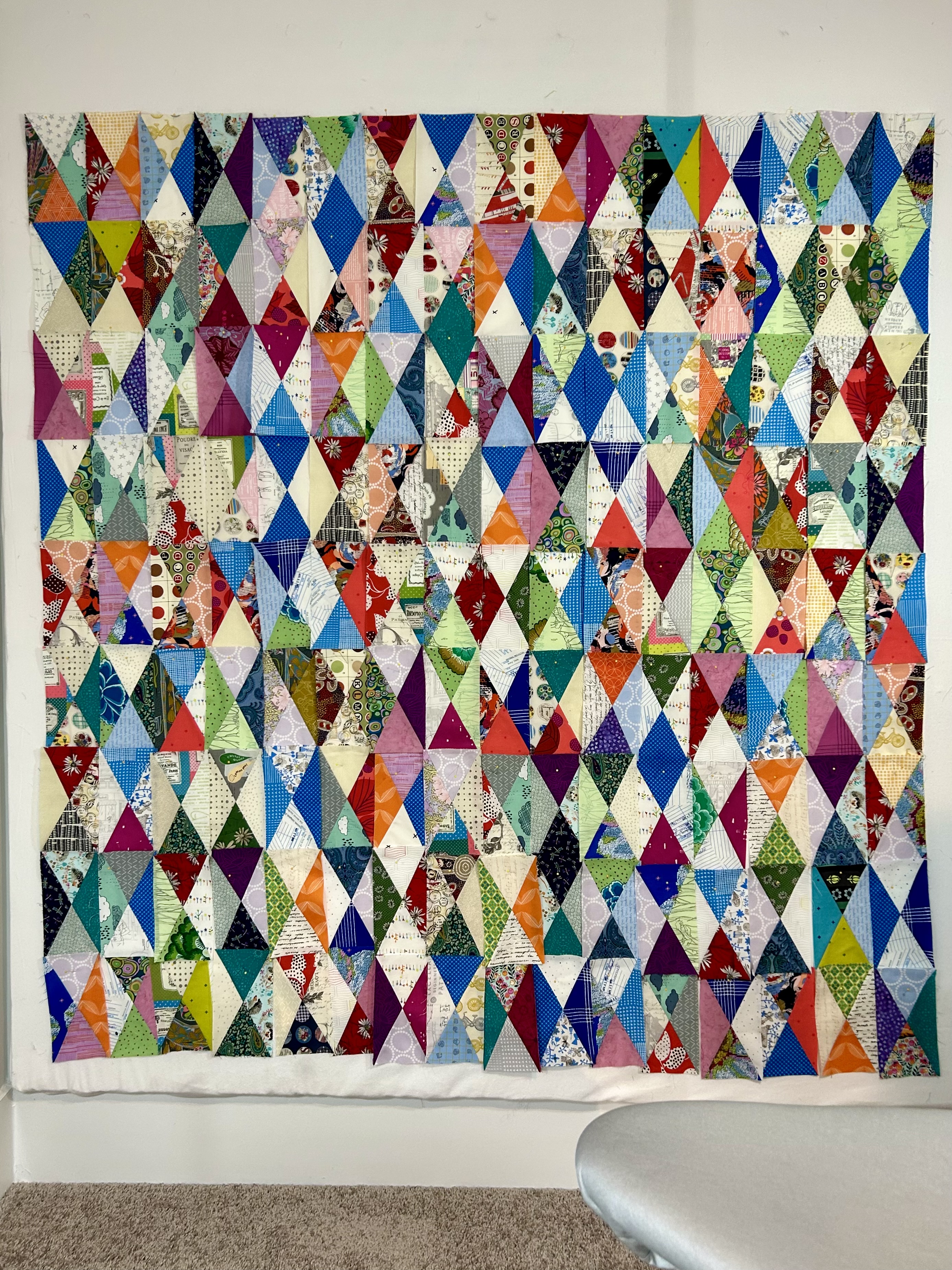 Here’s the third quilt in my half-rectangle triangle series, made with the Hurty ruler (Latifah Saafir). “Dancing Hourglass Diamonds” has been so fun to make–one’s eyes go all over the place to see the diamonds that form with this block learned in Tara Faughnan’s Block 2 online class–the diamonds along the diagonal and straight lines, yes, but also medium size and large diamonds that form and shimmer before your eyes let them go again.