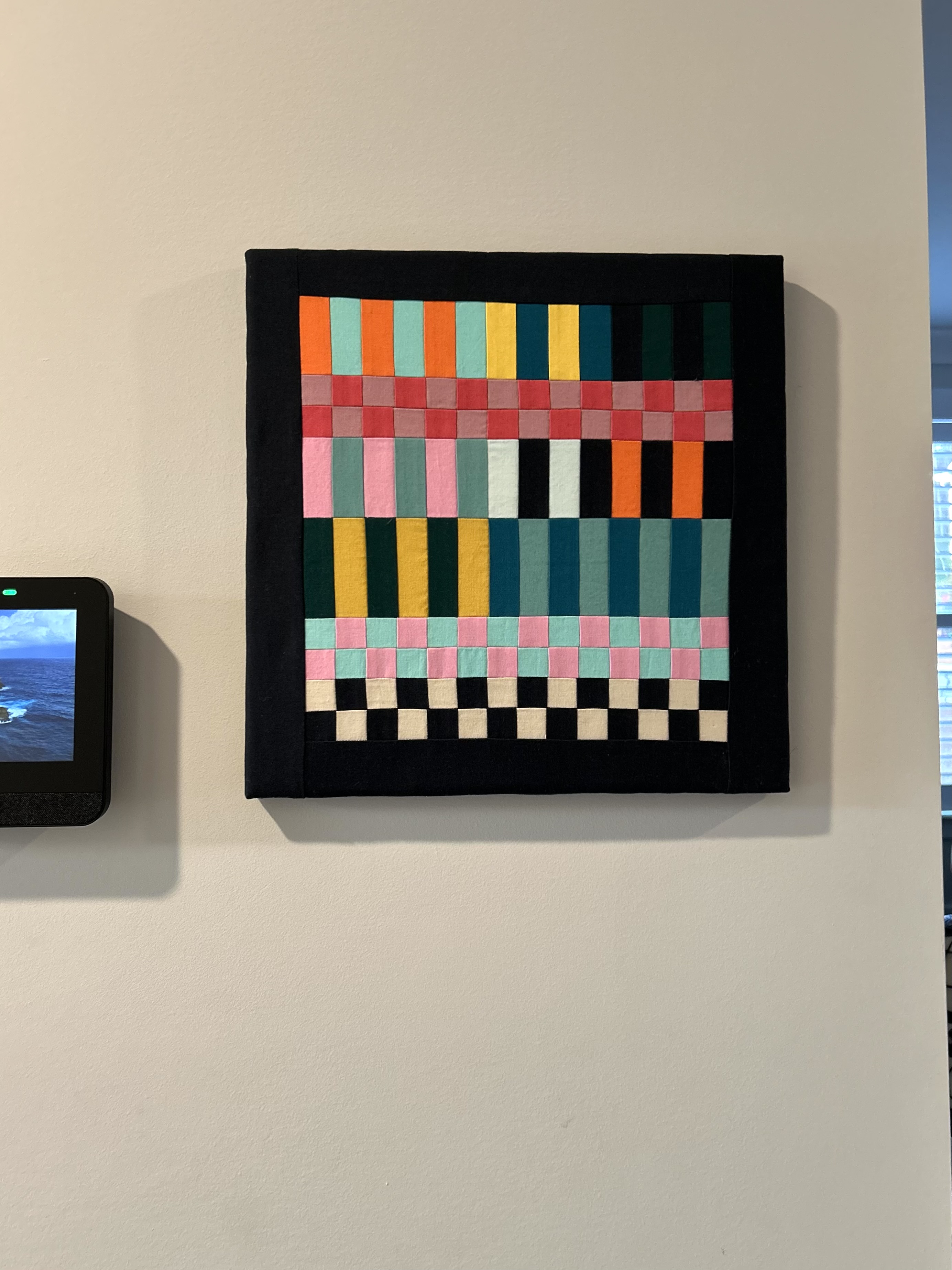 For this block, I made a tiny quilt and hung it in the front hall. I just used the leftover grey strips to make it–and try out this pattern. It’s kind of funky–and I like “kind of funky.”