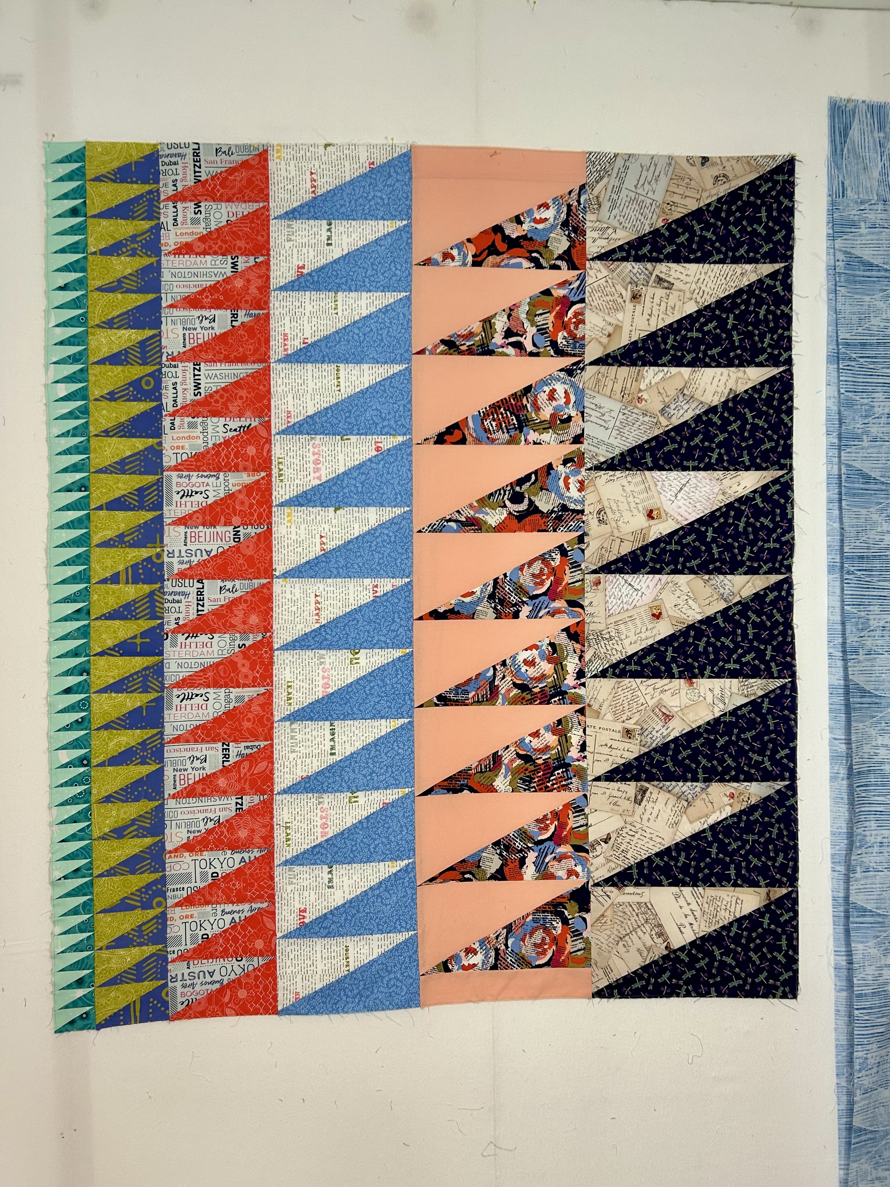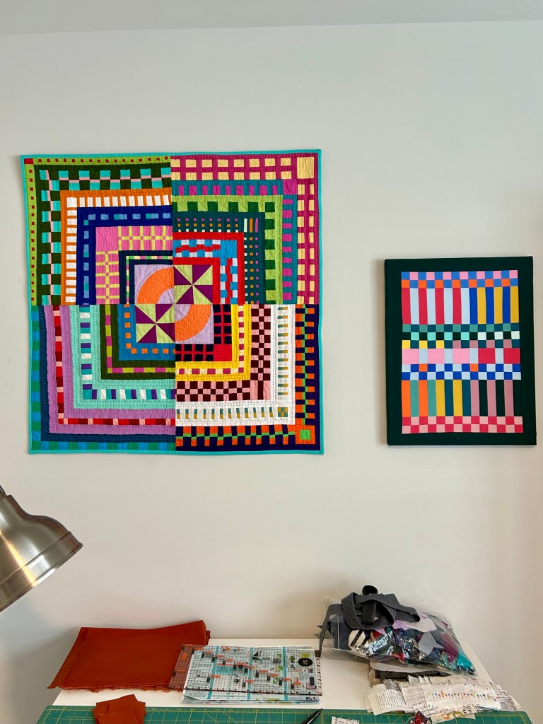 Tara Faughnan’s Block Studies 2 online class will release a new project January 1st. Meanwhile, I hung one of the “Abstractions” pieces I installed over stretched canvas on the wall in my quilt room–next to the Maria Shell inspired project that a local quilter here taught us (Cathy Beemer) in our Charleston Modern Group’s monthly Sit and Sew. “Abstractions” is a bit like this Maria Shell style. I suspect I will hang more pieces made in upcoming months on this wall. I couldn’t part with this “Abstraction” piece.