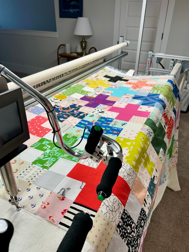 “Crosses” is loaded on the longarm, and I did one pass days ago. But until this quilt is done, I didn’t have any binding handwork for tv at night. I find hand sewing so soothing. “Crosses” isn’t a large quilt, and I should make myself do one pass a day until it is finished. (“Crosses” is made from the 3 1/2 inch squares of Cotton+Steel/Ruby Star Society fabrics I cut up years ago in Maine.)