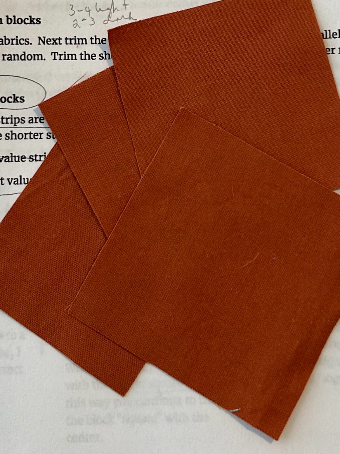 I’ve been pondering what color to use for the “chimney” block at the center of these log cabin blocks, and I settled on this brick red. I like it, and I have enough of it in my stash. Rachel used a mustardy gold solid, which works well, but if I wanted to make a set of blocks using gold/yellow, Rachel’s color wouldn’t work well. This brick red might not work with clear red strips, but I will have to see what those colors do with each other–adding in the idea that alongside a red would be some other color as well–which could “buffer” the brick red. I call that…creative play.