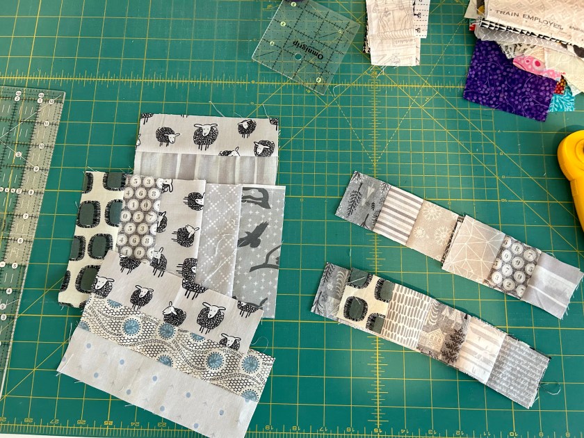 There are, also, other projects happening in the quilt room. I broke down the last of the separated Cotton+Steel/Ruby Star Society strips and put them into the regular bins–1 1/2, 2, 2 1/2, and 3 1/2 strips–separated by neutrals and colors. And as I pawed through these boxes for the funky log cabins, I isolated some shorter strips, starting with these greys, and sewed them together and cut them into 2 or 2 1/2 blocks, in strips. ( I have smaller bins of cut 2 and 2 1/2 blocks and one of just small scraps–and ***note to self, I should/could be sewing together 4 or 9-patch blocks as leader/ender projects from these cut blocks.)