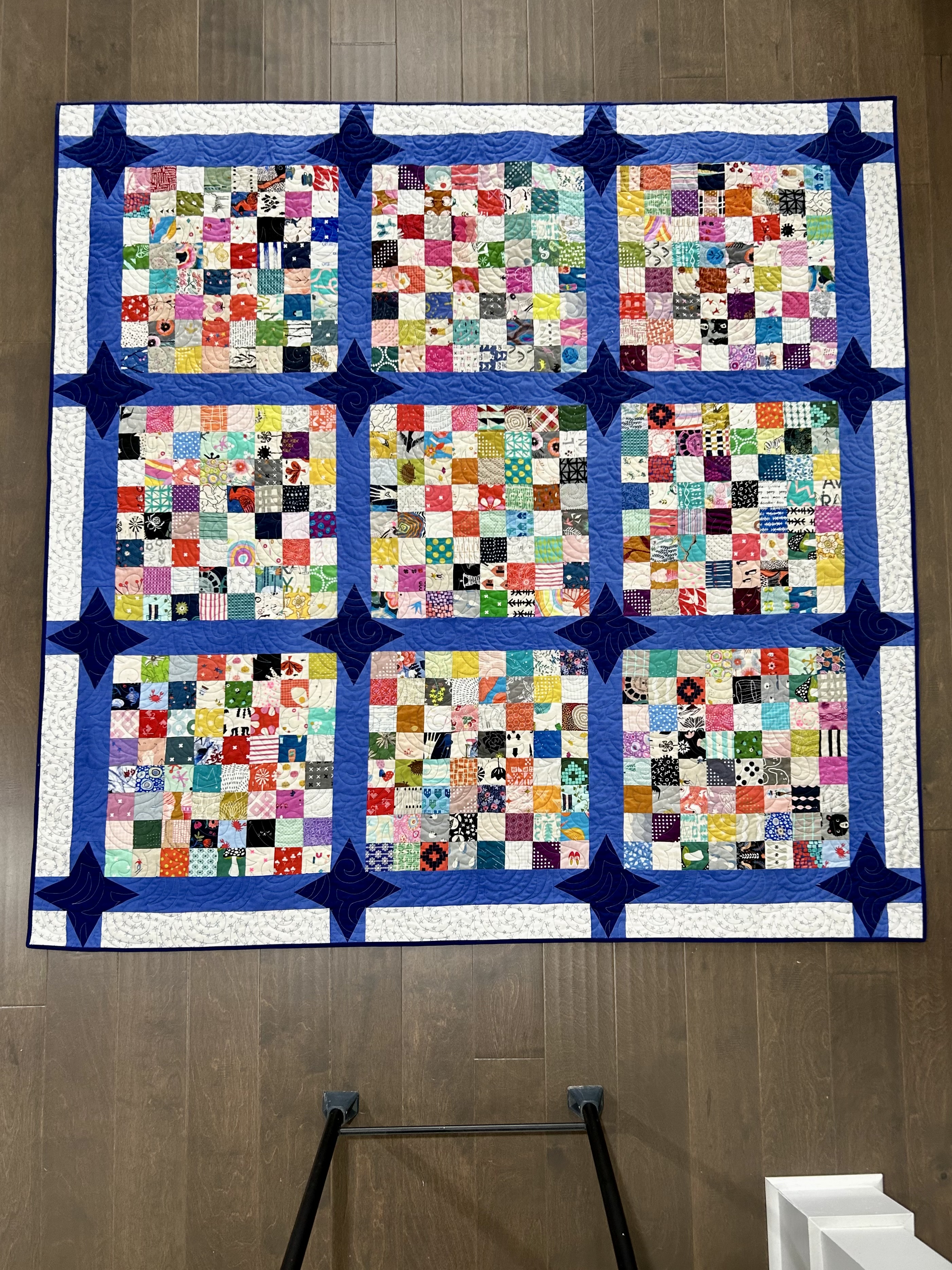 “Big Slice” was the fifth month project–a new Tara Faughnan “wedding ring” block. I had made her older version years ago. I loved her fabric palette for this project, so ordered those fabrics and added a few more colors from my stash. This one is waiting in line for the longarm. It is 60 by 60 inches.