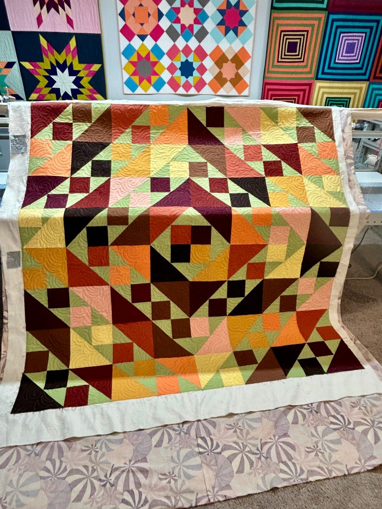 “Fall’s Splendor” is off the longarm, trimmed and bound, and getting its binding sewn down at night. I’m really happy with the quilting texture and the thread color (a mustard yellow/gold).