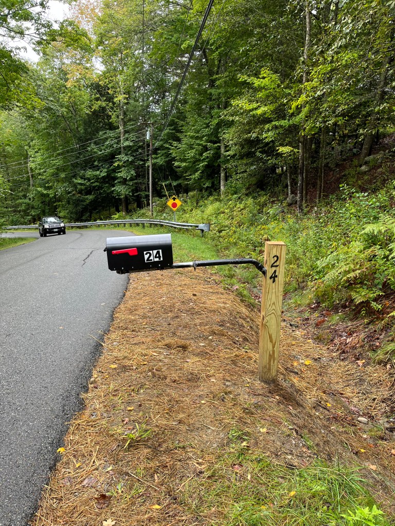 But, the mailbox is up as of this morning—and I’ve installed street numbers AND red reflectors, which were not up when I took this picture. The box is too close to the road, but Tom Jackson will just slide the silver pole deeper into the back black pole to move the box back. Right now it is asking for the local baseball-bat wielders to take a shot. The mailbox is smaller than my old box, and I’m not sure how that is going to work out for PO packages. Hopefully they will come up to the house and NOT go to Rockland where they will have to be retrieved.