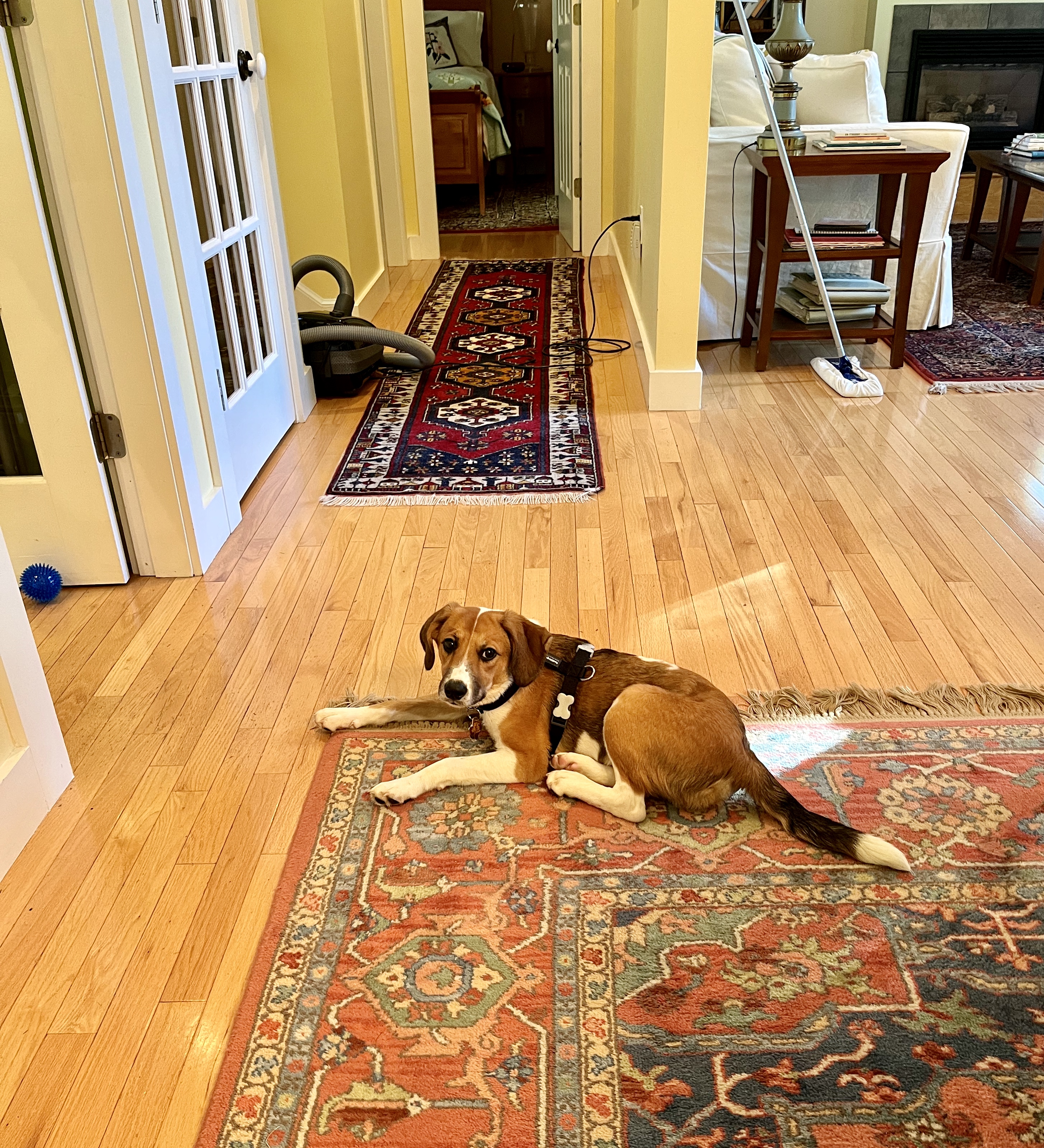 I’m close to moving back to the living/dining room table with him if he’s pooped in the morning and if I continue to take him out frequently, which I will. He still has to have my eyes on him though so he doesn’t get into mischief. He loves the big dog bed in that room, and the long hall allows for a ball to be rolled down it. He would love having the extra space, I know.