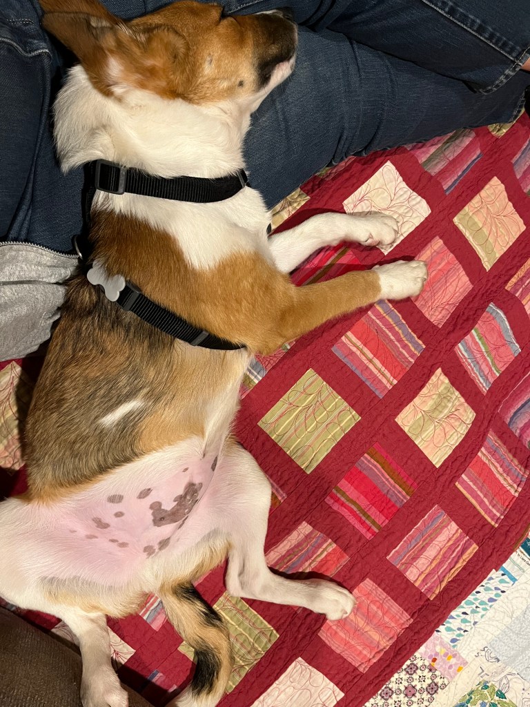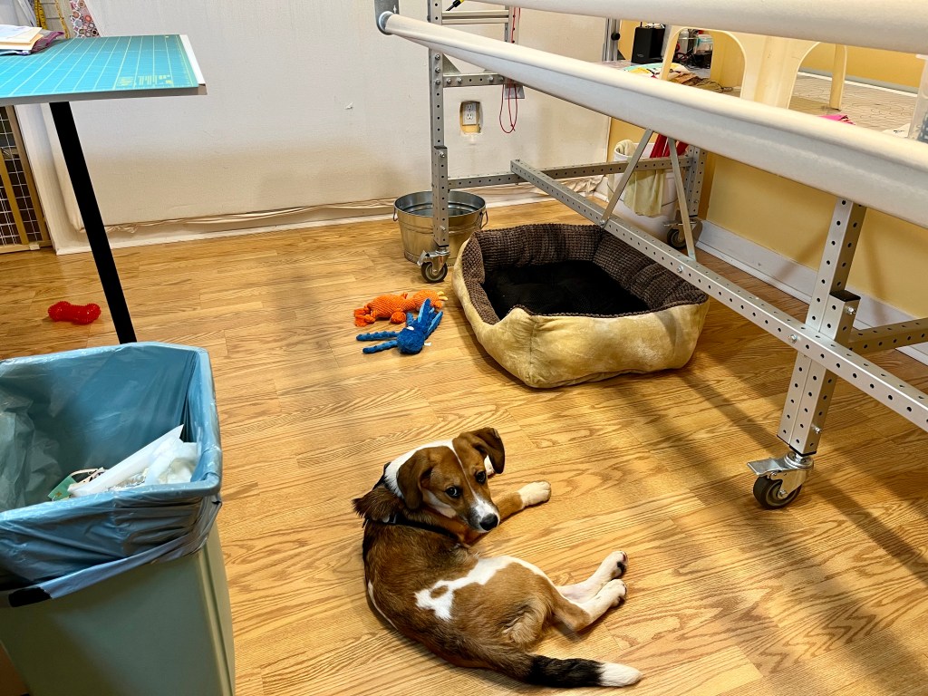 Yesterday I tried out the quilt room for a short period. I put down the beautiful dog bed I’ll use and brought in the toy bucket, and after a struggle to figure out the door gate got that up, sat quietly to see what JP would do. He fussed for a bit and then laid down on the floor and rested. He’d had two walks/runs, so he wasn’t antsy. So…. I think that will work for piecing and cutting, but not yet for the longarm. Soon.