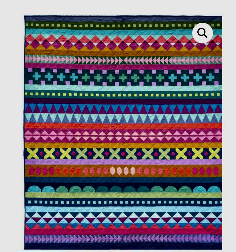 Here is a picture of Tara Faughnan’s sample quilt–done in the Windham Artisan “shot” cotton solids, which I chose. Other choices were Kona solid cottons in colors or neutrals or the Artisan cottons in neutrals. All of these quilts are beautiful, and the rows are fun to make, though the two flying geese rows were super challenging for me as each row needs to measure 72 1/2 inches.