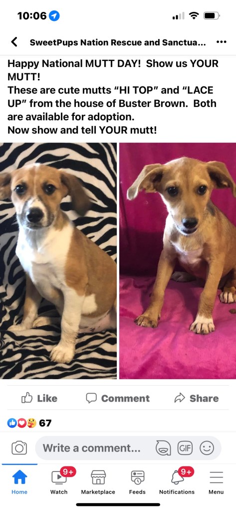 There is an adorable video of Buster Brown. If the link doesn’t work, you can see it on my FB page or on the Sweet Paws Sanctuary FB page. Buster Brown is Jackpot’s brother (and clearly had a different dad—as is true too for Lace Top, the girl). Buster was too sick to rescue, so the Sanctuary is getting him sorted, and you can see he is doing much better. Recall that the mother dog had been tied to a tree for her whole life, and had her puppies there, but that the owner finally surrendered her.
