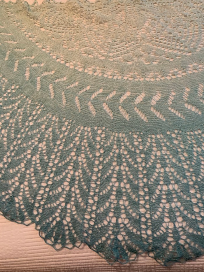 Many of my blog readers liked seeing master knitter Giovanna’s recent work. She just sent me pics of two shawls she just finished and that are now blocked and ready to wear. Giovanna is one of my Camden, Maine, friends.