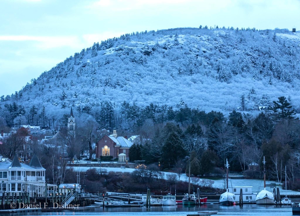 Here’s a picture from ”Coffee on the Porch,” a local business that publishes beautiful local pictures on Facebook. This one was taken at dawn from across the harbor. The lights are inside our beautiful library. And the town will slowly come awake now to find this first snow.