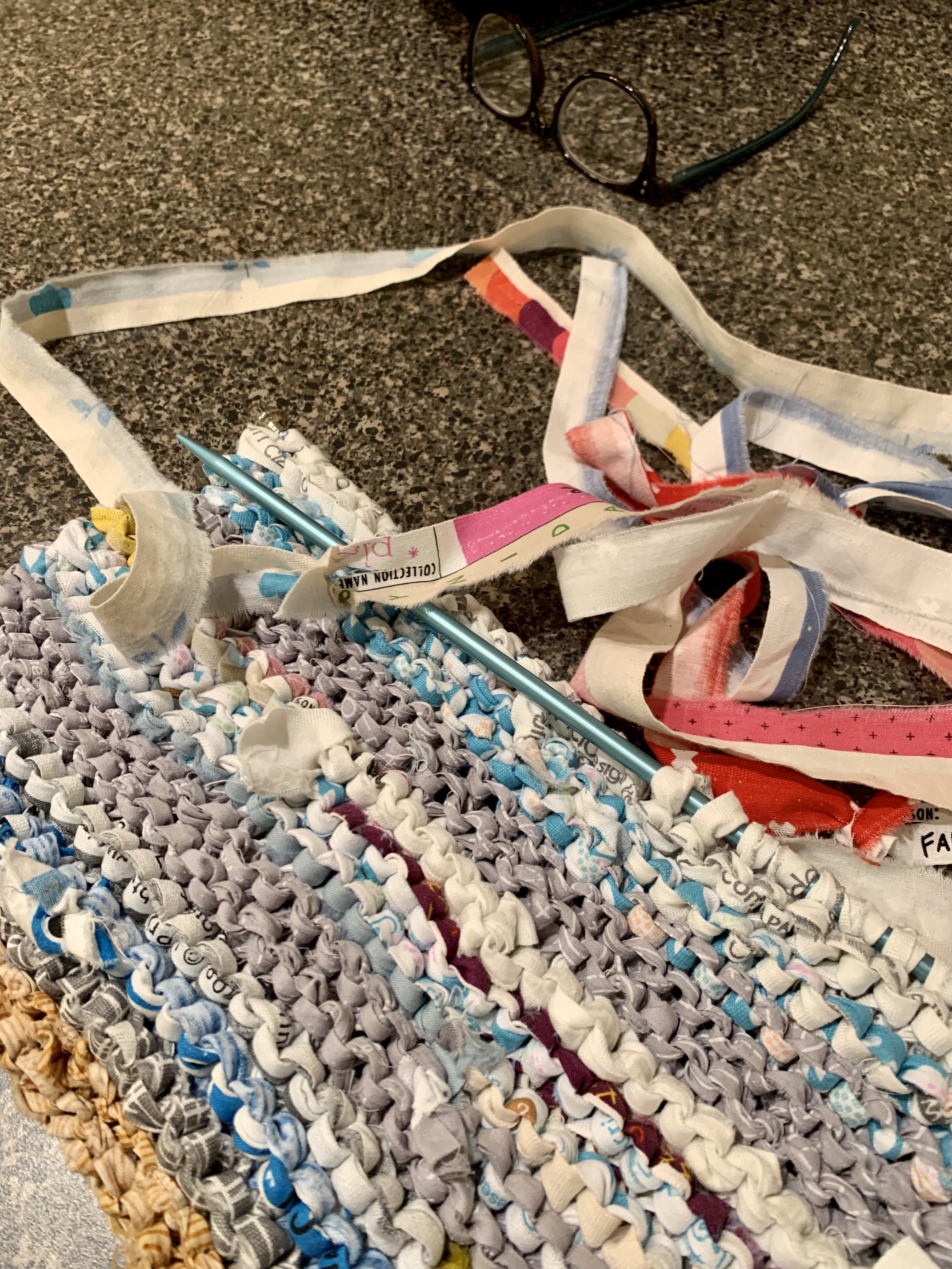 I have enough placemats now, so maybe I’ll try knitting some sort of small rug for the kitchen or a doorway or, even, a bathroom…