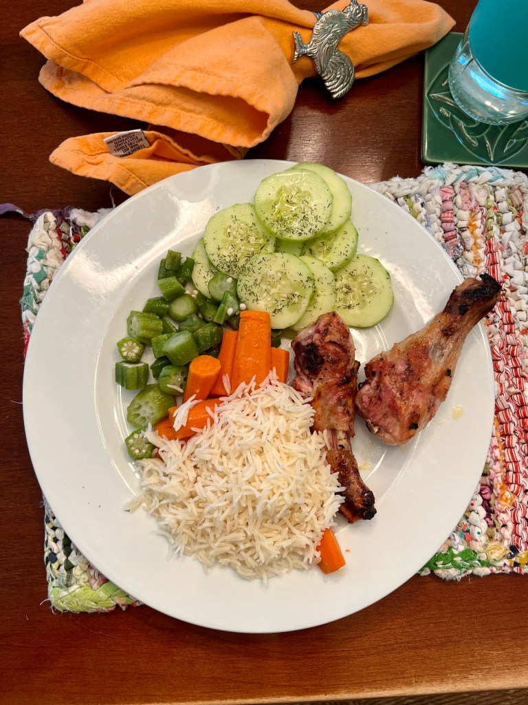 I grilled a package of drumsticks—it doesn’t take long and they cook while I cooked the rice and the carrots. The rice only takes 10 minutes—and yes it is not an especially good food choice, but this basmanti rice is so fragrant and rich with a buttery flavor. It’s a treat. The okra is from the frozen okra packets I found at the Belfast coop. The cukes and carrots are organic. I so love our local cucumbers in the summer—just cold and sliced with a little salt and dill and a scant drizzle of olive oil. If I could, I’d add a splash of vinegar.