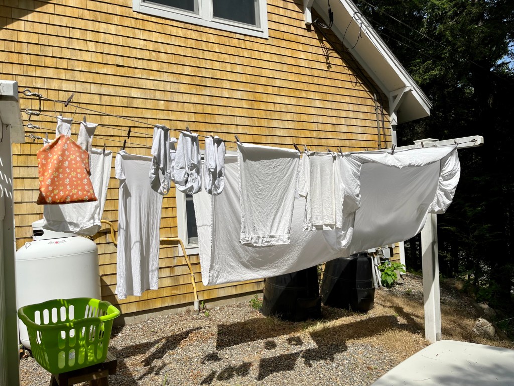After I had my morning coffee, I unmade the bed and washed things as I would not be able to hang my sheets on the line tomorrow. I love my clothes line. And I love sheets that have dried in the sun.