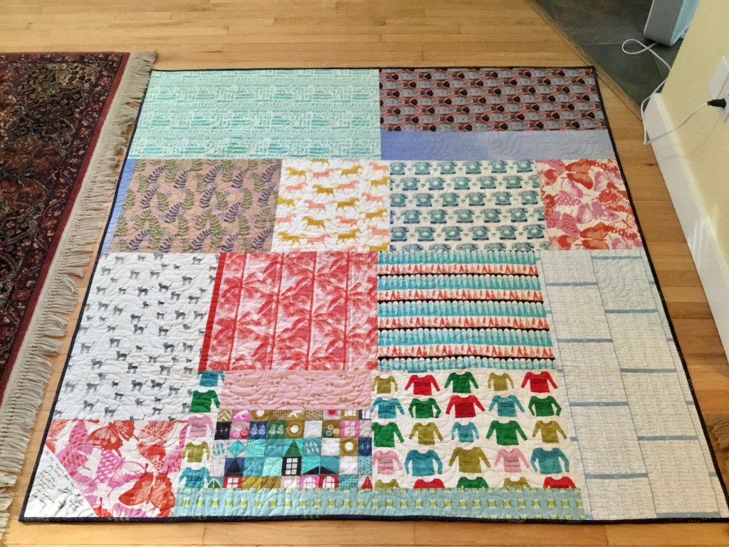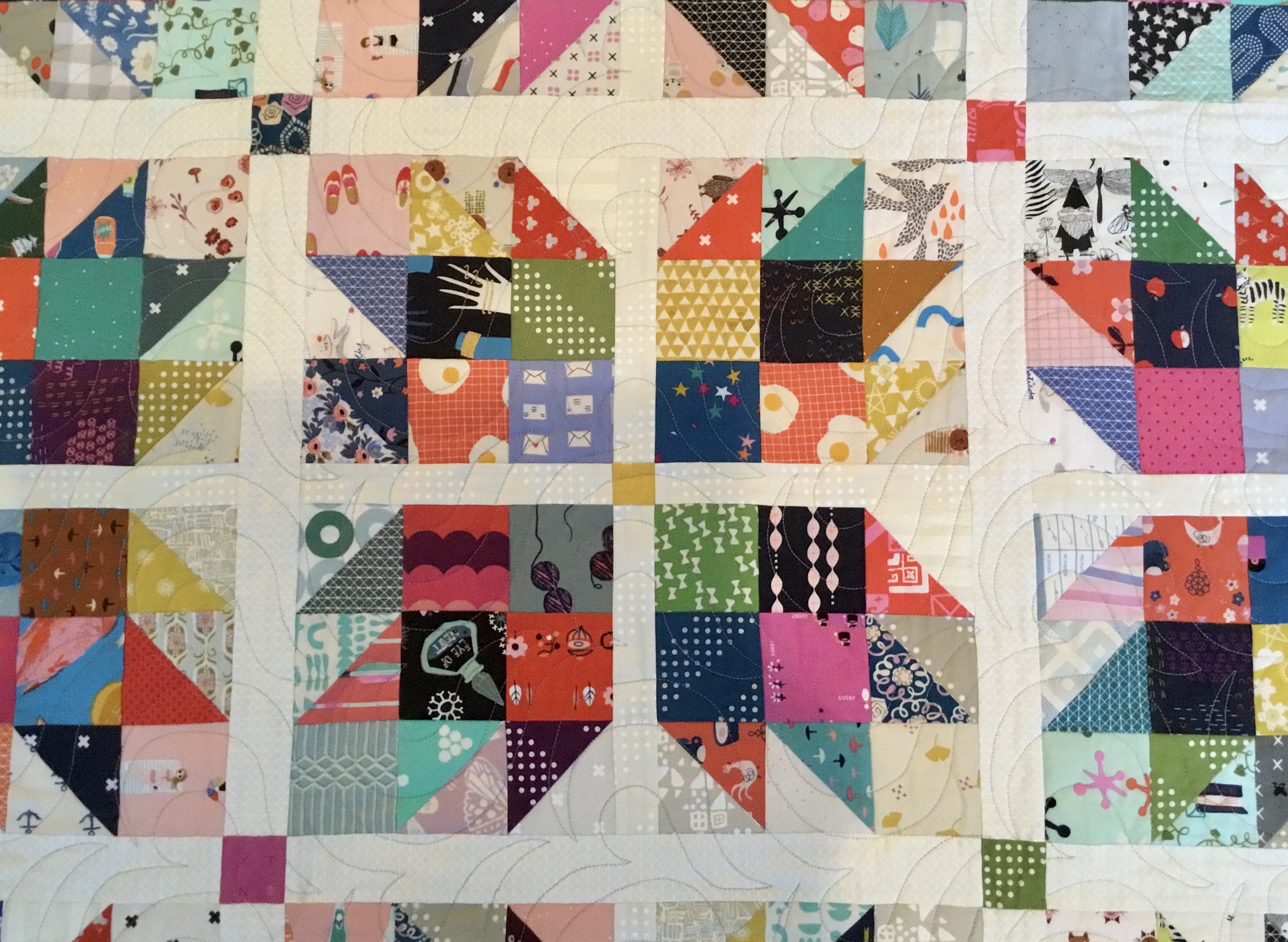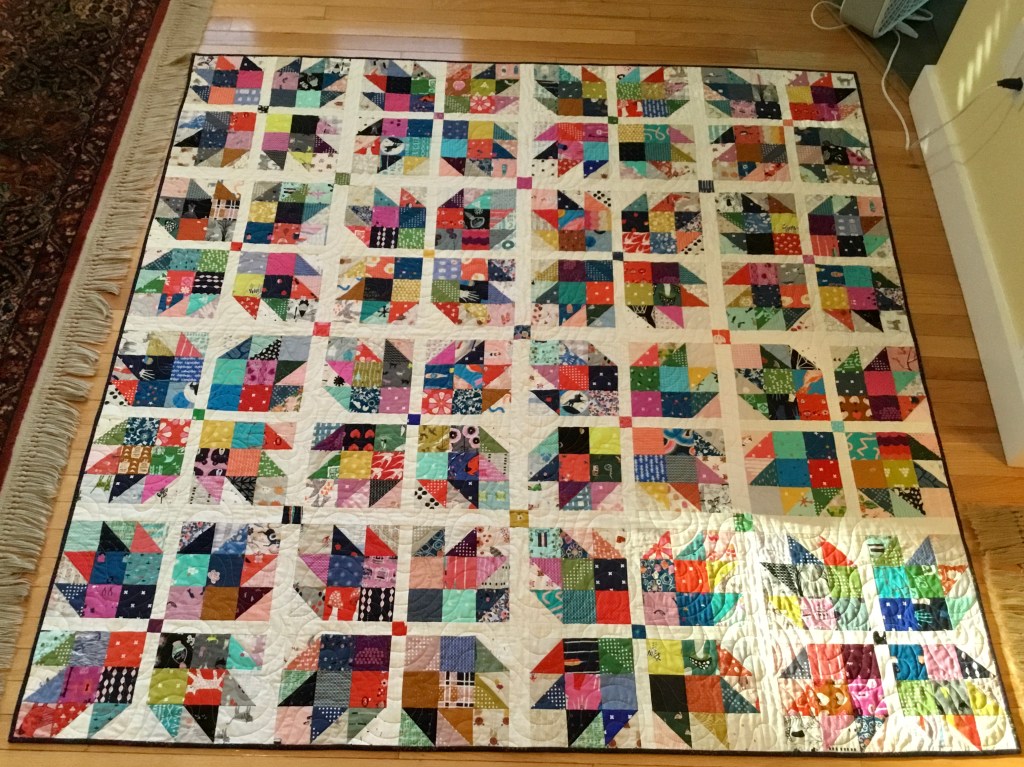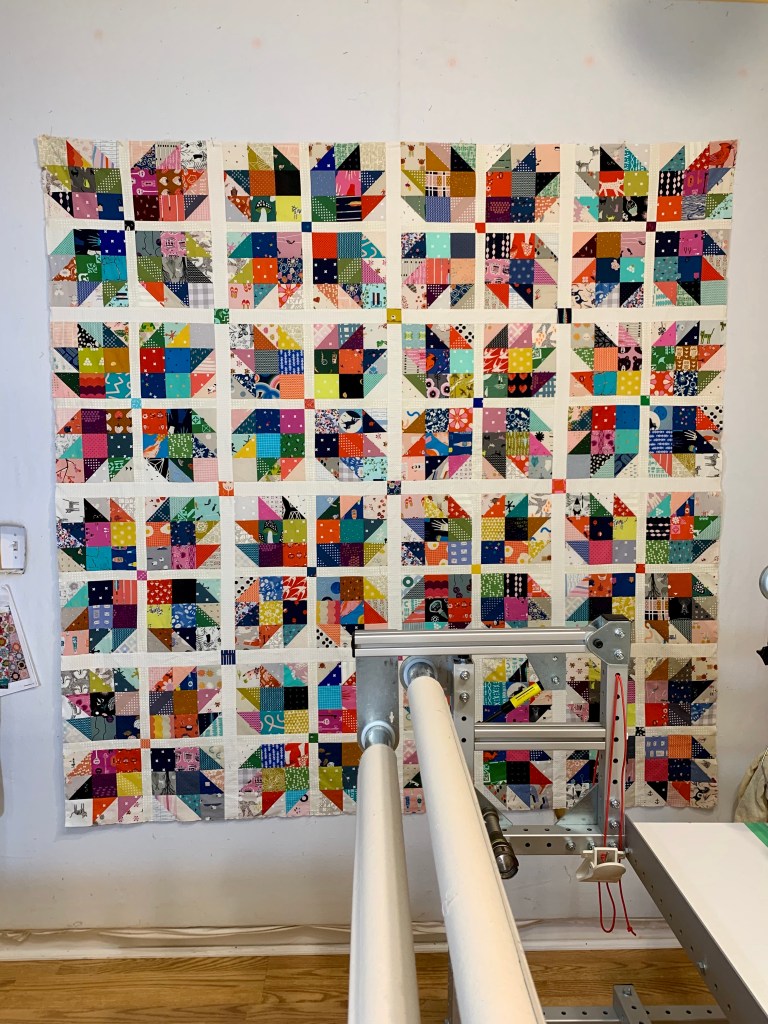 Here’s he finished quilt top. Note that I used a clam shell groovy board to quilt it, and I do like that traditional quilting on this modern quilt.