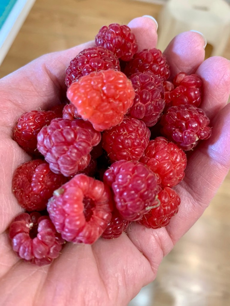 I have frozen local organic blueberries, so I start with a half cup of those. And, an apple I’ve seeded but not peeled. I have some frozen peach slices from a neighbor’s gift of fresh peaches last summer. And, I froze a bag of my raspberries last summer as well. I limit fruit to 1 1/2 to 2 cups–and a big blender batch makes enough of these drinks for two days. (I wouldn’t keep drinks longer than that I think.)