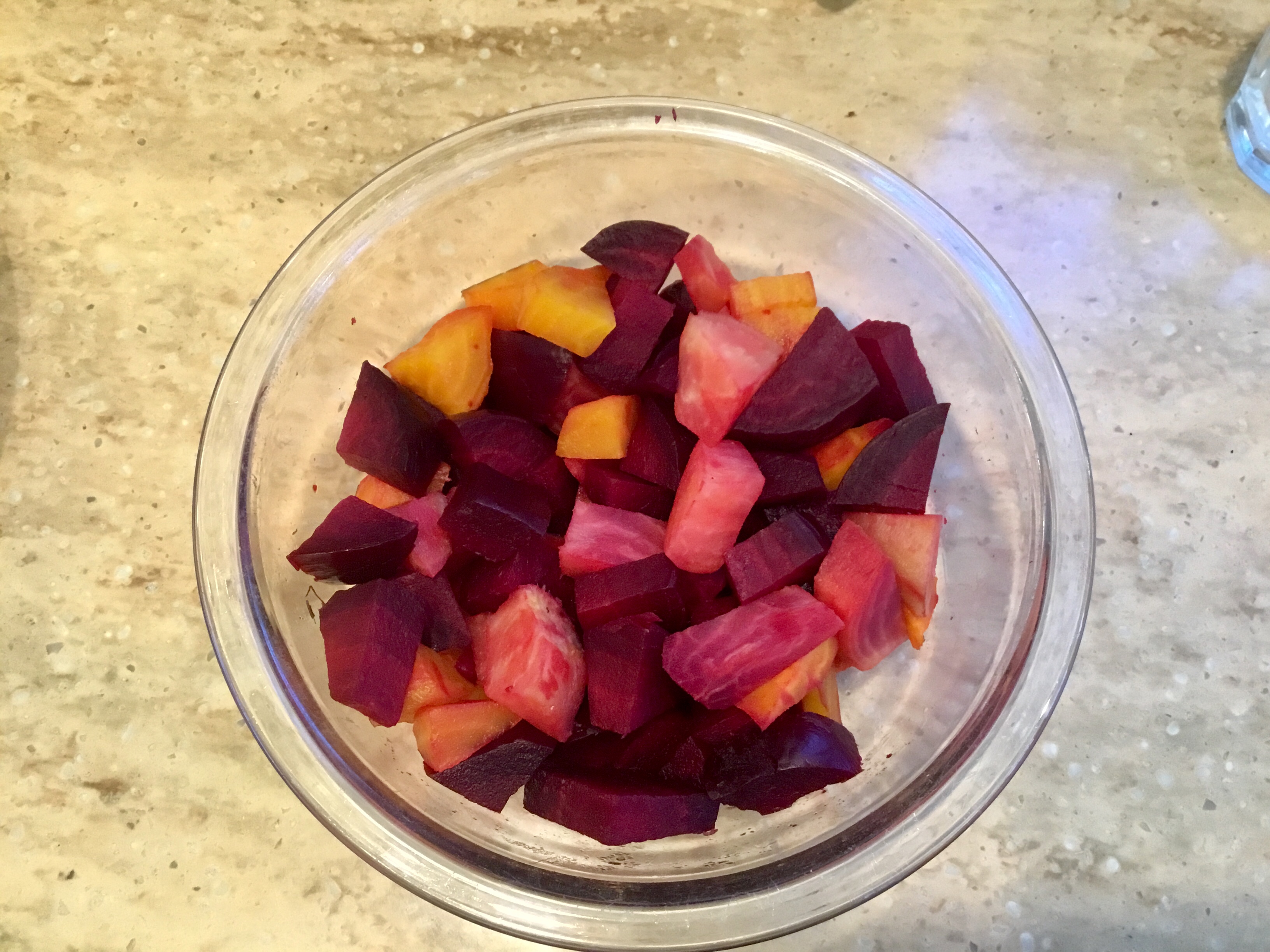Anyway, you can see this chicken is accompanied by a sweet potato and a handful of small red and golden beets. You don’t have to peel them when they are small. Just wash them good, quarter or halve them and drizzle them with some fat and whatever herbs or spices you want.