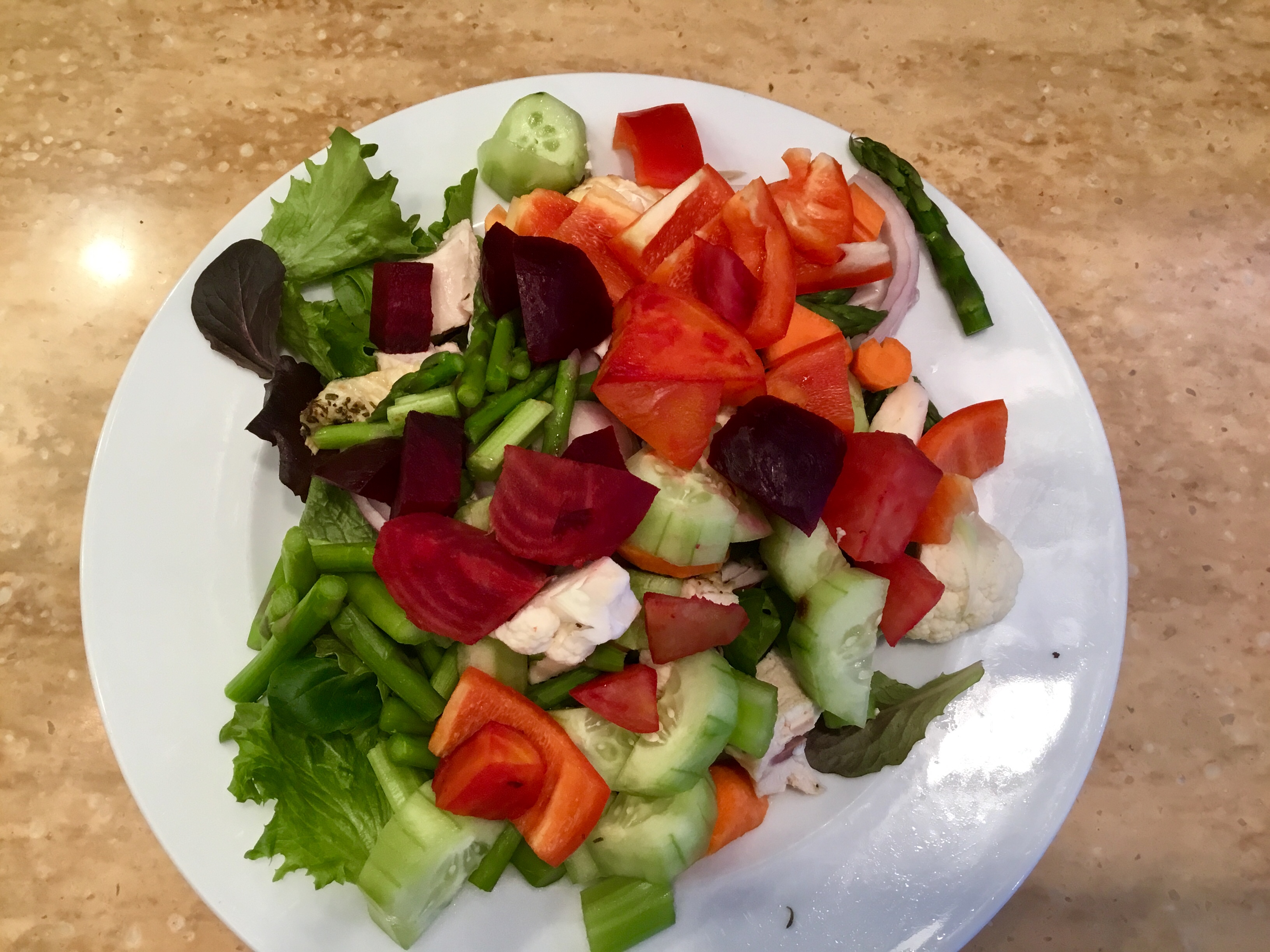 Lunch is, most often, a BIG salad with lots of raw veggies and a meat protein. I use herbs, salt, and a drizzle of EVOO olive oil since I cannot do vinegar. The taste of the veggies comes through loud and crunchy and, often, very sweet. I don’t miss the vinegar because once I got away from it, or lemon, my tastes changed. Suddenly I could really taste the vegetables, and they were delicious.