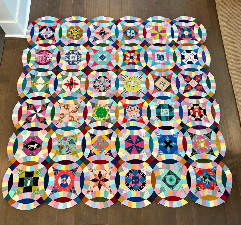 The block centers are all Cotton+Steel/Ruby Star Society. The rings are solid pastels, and the ring centers and the 4-patches between the rings are all dark solids. The outer border will square it off and is made of BIGGER (thank heavens!) pieces–all dark solids.