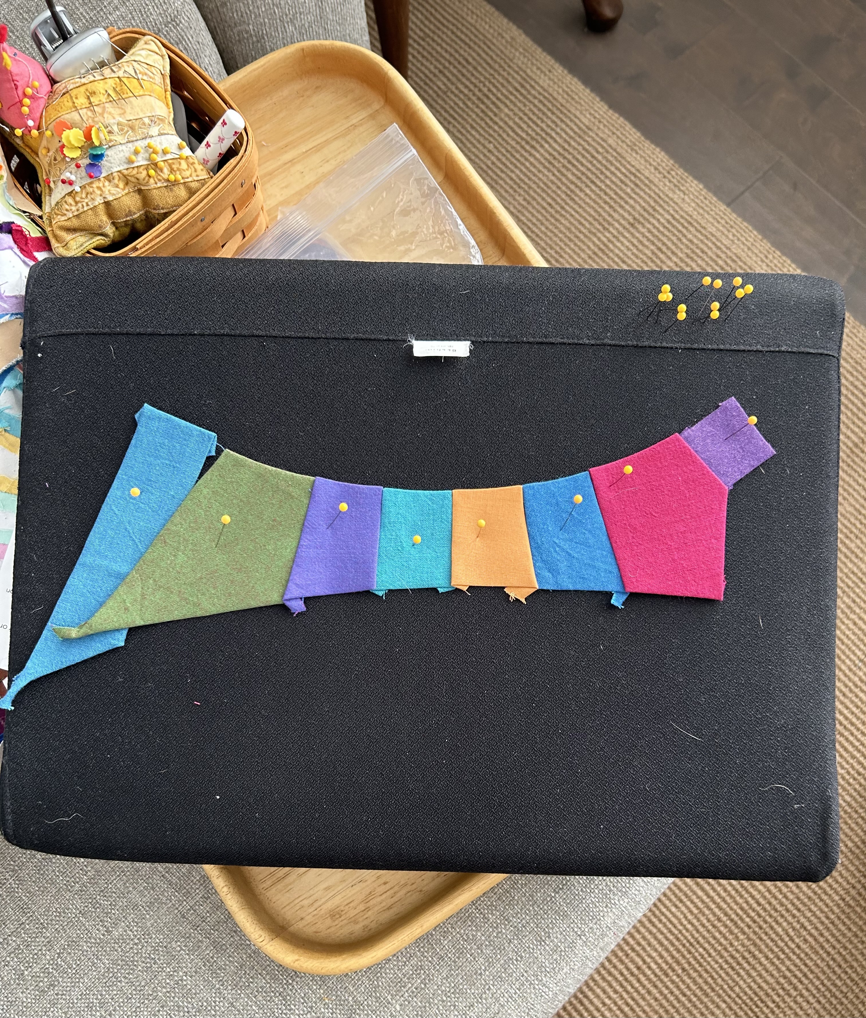 I got the two large pieces joined by Monday at some point and ironed the top. I spent a chunk of time late Monday and Tuesday cutting and making the border templates. Here’s an example of one of the border units–a corner piece. They will be turned so that that little square goes down into the quilt and will finish off the 4-patchess. So, yes, more curves to sew!!!