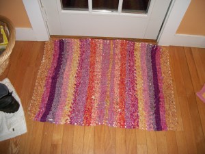 I have two looms, a placemat size and a rug size that is about 2 feet by 3 feet. I got the rug-size loom first, and my first project was a rug for our kitchen door. We had just painted the kitchen a color called “beeswax,” from Benjamin Moore paints. It’s a warm, soft color in the orange family. So, I wanted kitchen rugs to have warm colors.