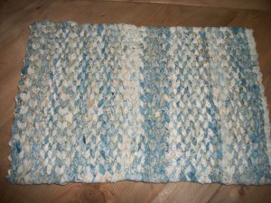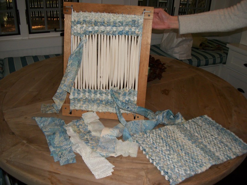 Last summer, Tami told me she’d love to make some of the placemats I had made using a simple hand loom and fabric strips. About two years ago, I took a class at Alewives Fabrics, Damariscotta, Maine, to learn this technique. The book that contains directions for both the looms and how to weave the rugs is RUGS FROM RAGS, by Country Threads. I think even I could make one of these looms.