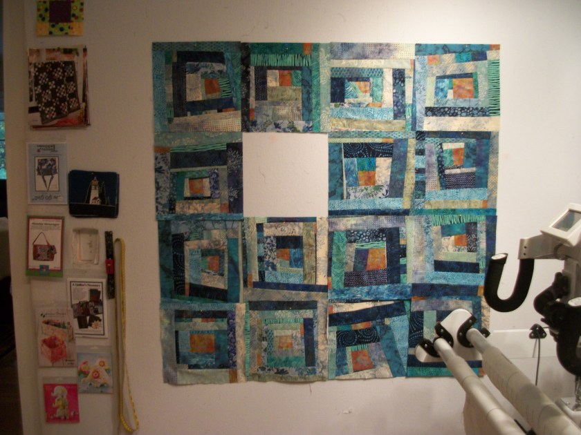 Finally, I’m working on a new quilt–based on Rhea Butler’s method, called La La Log Cabin.  Rhea is from Alewives quilting in Damariscotta Mills.  Here’s a picture of the quilt taking shape on the design wall.  It’s all being made from batiks in my stash: