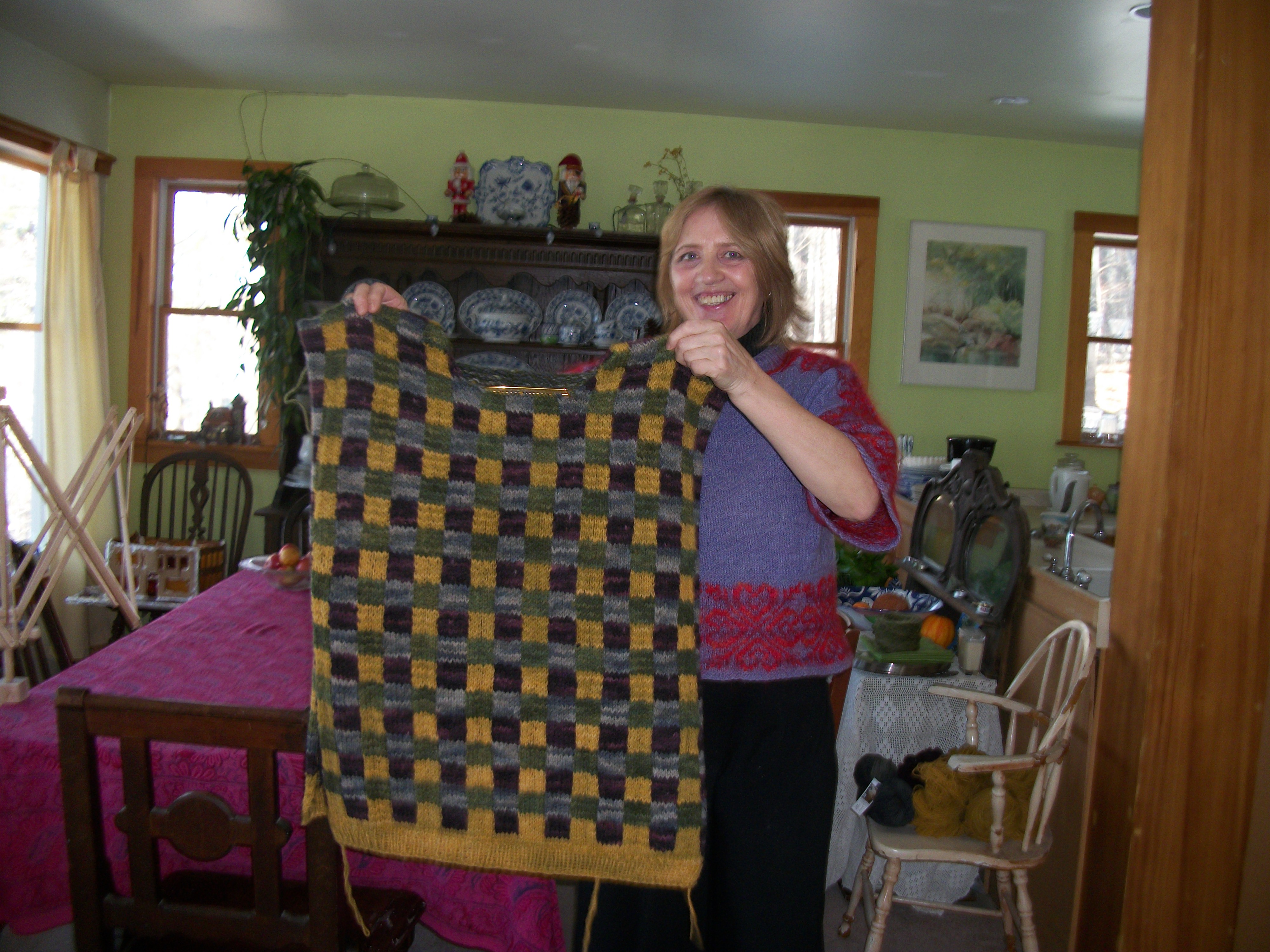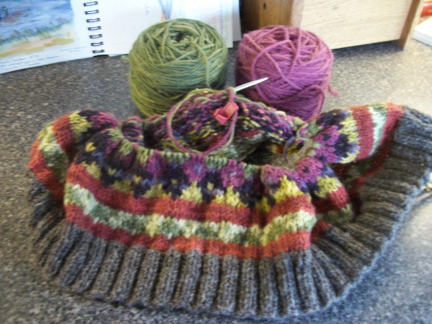 Aloisia Pollock designed the pattern for the sweater and the carrying color pattern and taught Giovanna McCarthy and I how to do it. You can view the yarn balls and get all the info on both of these terrific women from earlier blog postings in the knitting category. Giovanna chose different colors, and her sweater is gorgeous too. You can see Giovanna’s colors on the earlier posting as well.