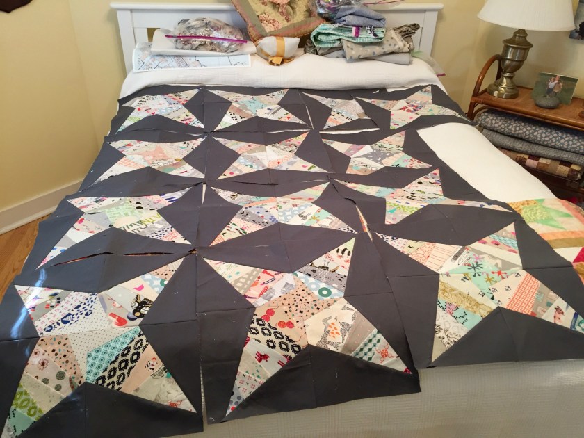 I’m going to put some wide charcoal Essex Linen (blend) borders.  Right now, this quilt is not big enough, really, to be lap size.  The border fabric is washed, but NOT ironed yet.