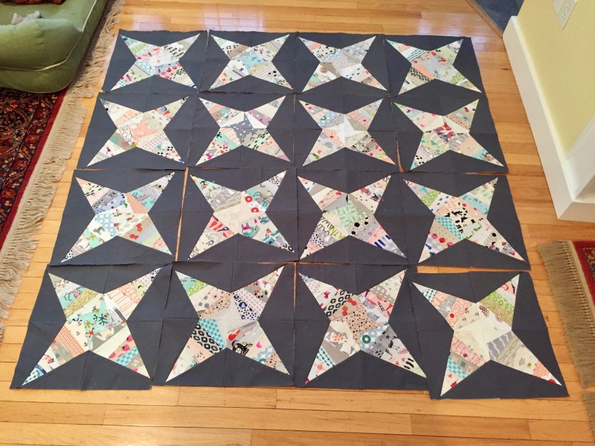 I finished all the blocks for the “Big Star” quilt, started in an Amy Friend workshop last year about improv paper piecing, the subject of her new book:  IMPROV PAPER PIECING.  The fabrics are Cotton+Steel, except for the charcoal solid.  Who knew I could make my own design?  I didn’t, but I really like it–though I recognize that it did not create any new territory.  I am sewing it together now.