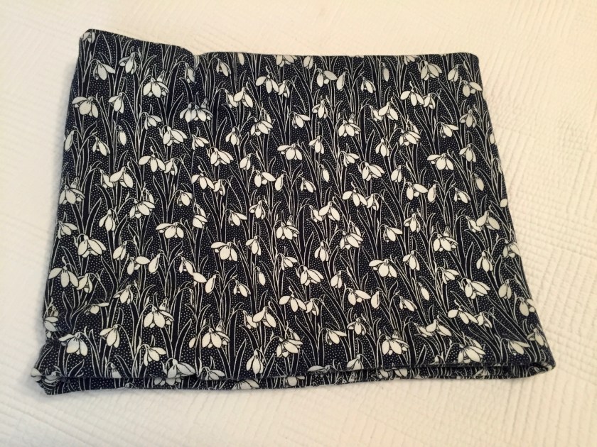Friend Gus Bruns dropped by and brought me this cowl that she made for me.  I love it!  She didn’t know that I love snowdrops and that I have them planted all over the yard.  The white on the navy feels like the essence of spring, doesn’t it.  The knit came from Alewives Quilt Shop in Damariscotta, Maine, and it is a sweatshirt knit.  Well!  I’ll have to slow down and go down for a visit as I’m looking for a knit in which to to make the Simplicity skirt, now that I’ve got the pattern “just right.”  The cowl fits “just right” too, and I really like it.