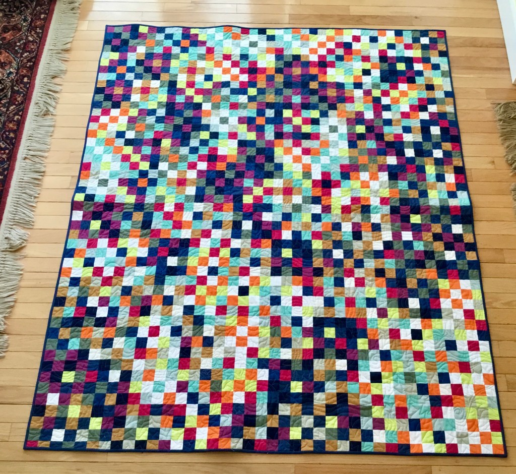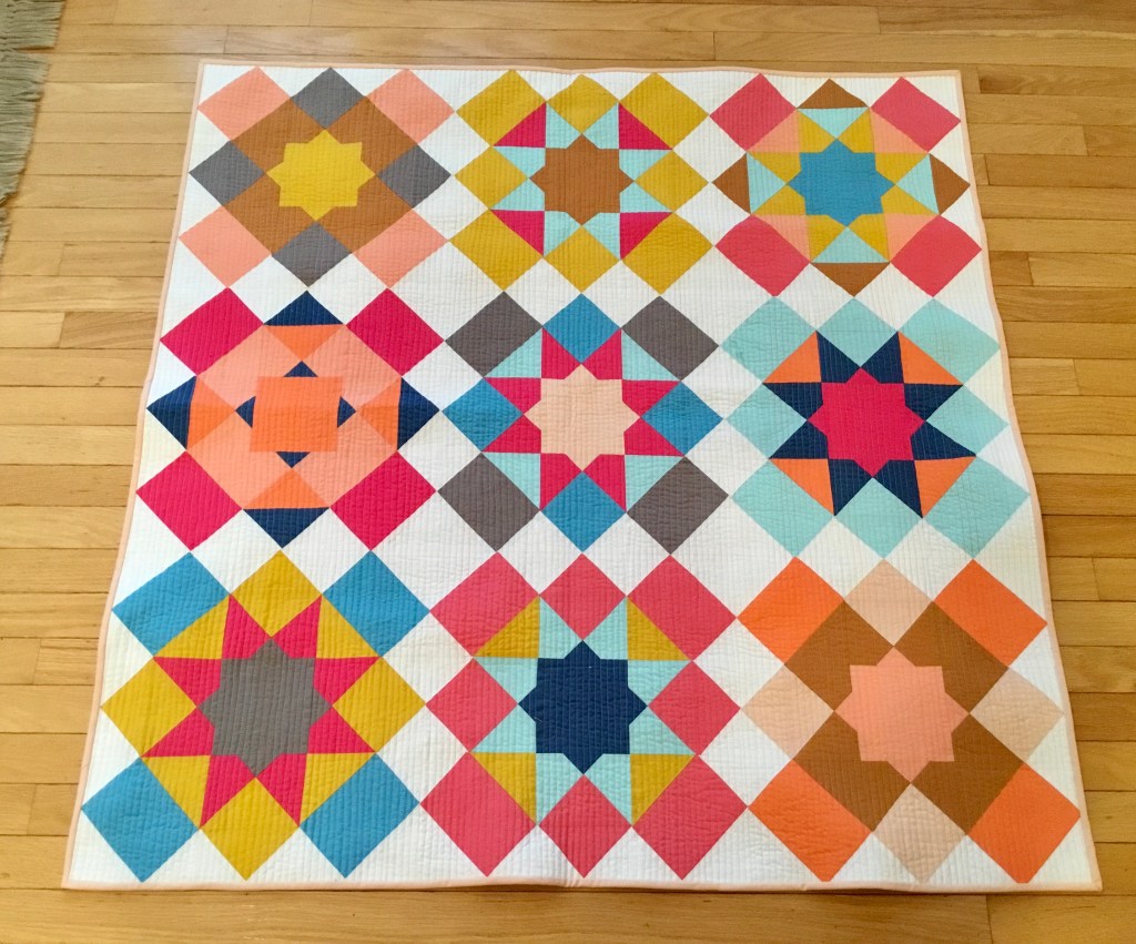 Latifah spread out her block by using blank pieces of her fabric palette (which I really love), but I wanted to play with how the block worked when all were together without interruption. Latifah’s version, though, is a very handsome quilt and a better choice I think if one wants a bigger quilt.
