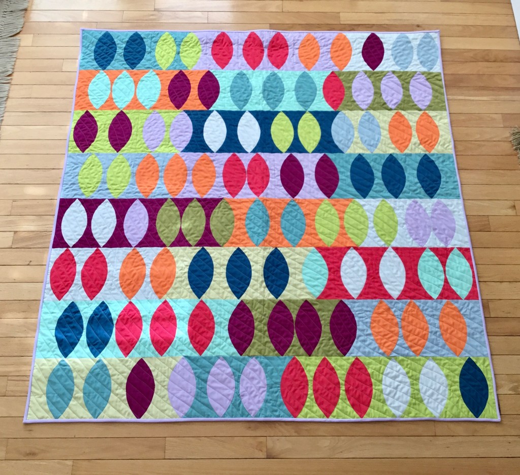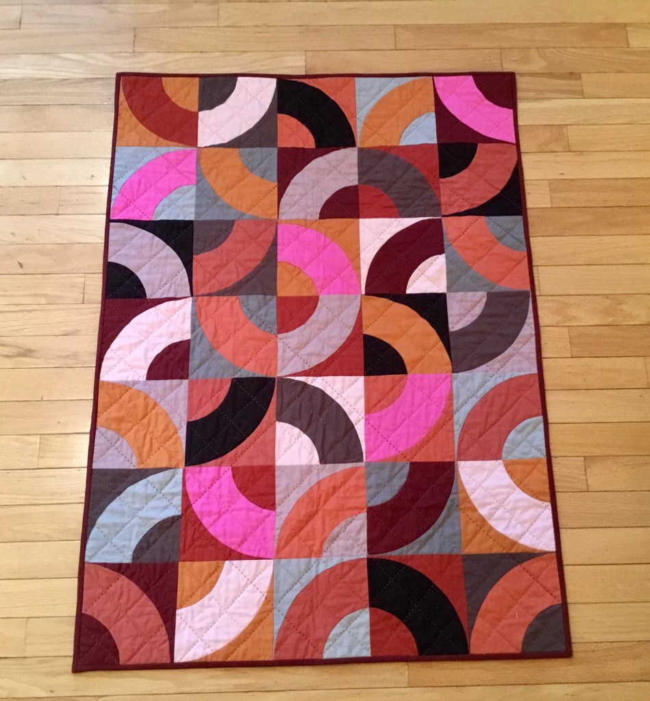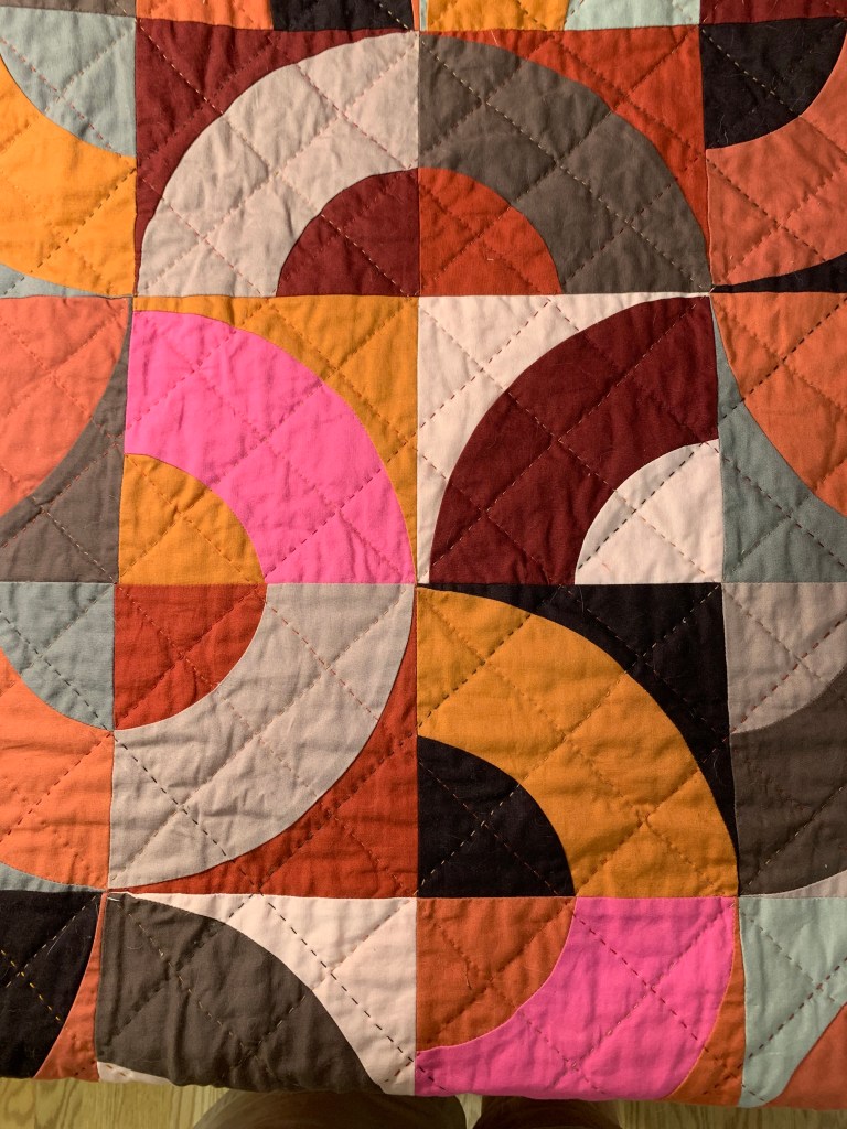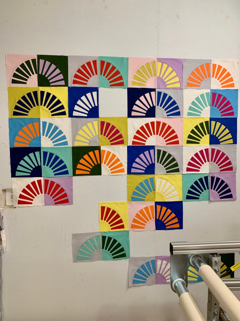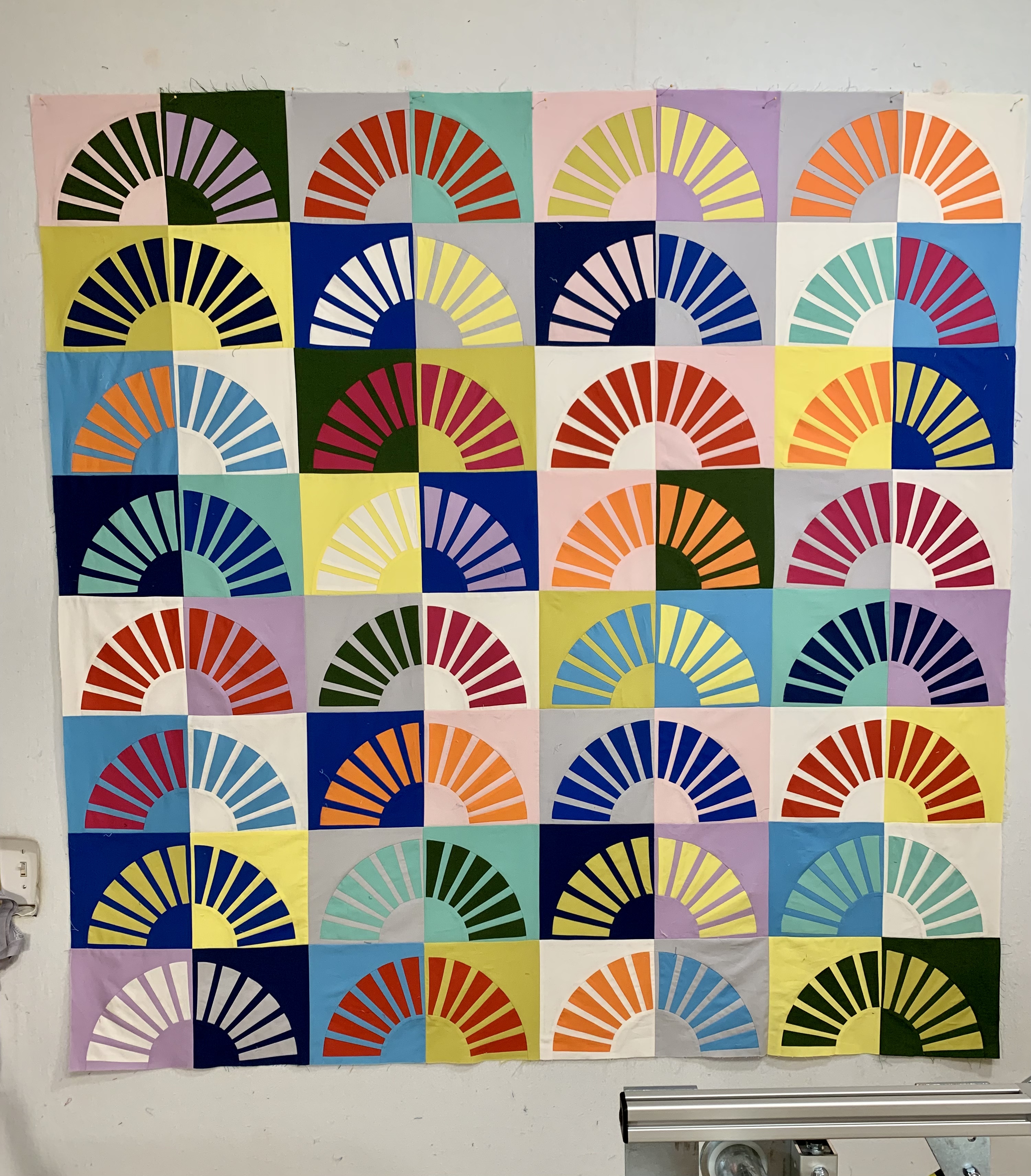 The blocks can be combined in many, many ways of course. In that way, ”Sunny” is like the ”Tenderoni” block Latifah Saafir designed for last year’s guest designer project in the 7th month. Tara set her blocks like the red and pink blocks in the picture above—like rising ”suns” made with half circles. And her quilt is…Sunny…so lively and bright.